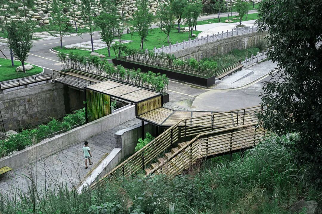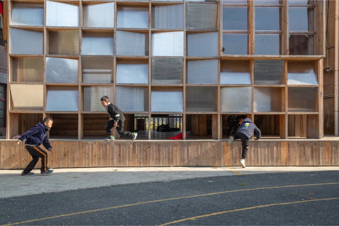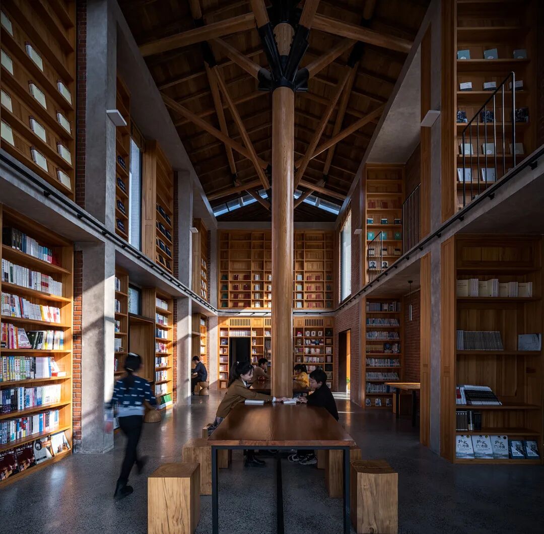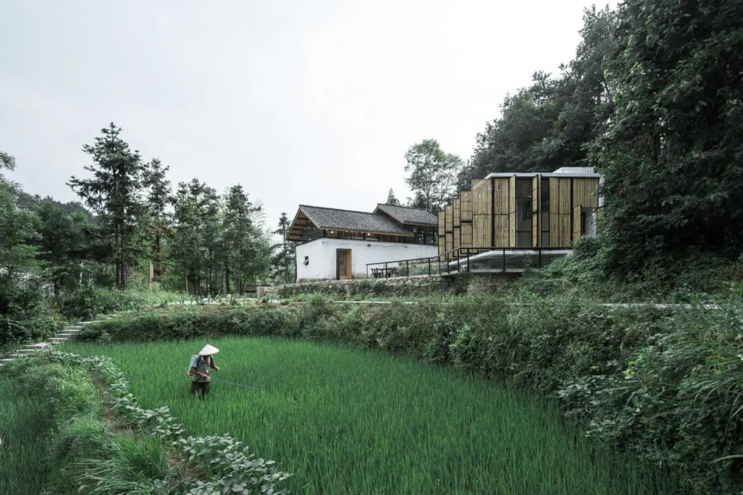 场地的水田、茶园、菜地都被全部保留并由它们原来的主人继续耕种,数条栈道被架设在水田之上,用最“轻”的方式使有人和这片水田交织在一起,栈道底层架空,水从栈道下方缓缓流过,禾苗垂与栈道之上,秋季收获之时栈道还为水稻收割和运输提供便利。来到书院的游客都要经过架设在农田上的栈道引导之下来到书院,春种秋收的生产活动成了书院的最佳外景,农耕的全过程被生动的展示在书院周围,没有什么乡村生活体验比真实的农耕来的更直接。人们可以与农业生产零距离的密切接触,可以与除草施肥的老农聊天。书院建成后镇上每天下午放学后的儿童都会来到座图书馆写作业和玩耍,古人追求了千年的“耕”与“读”在此被重新演绎。