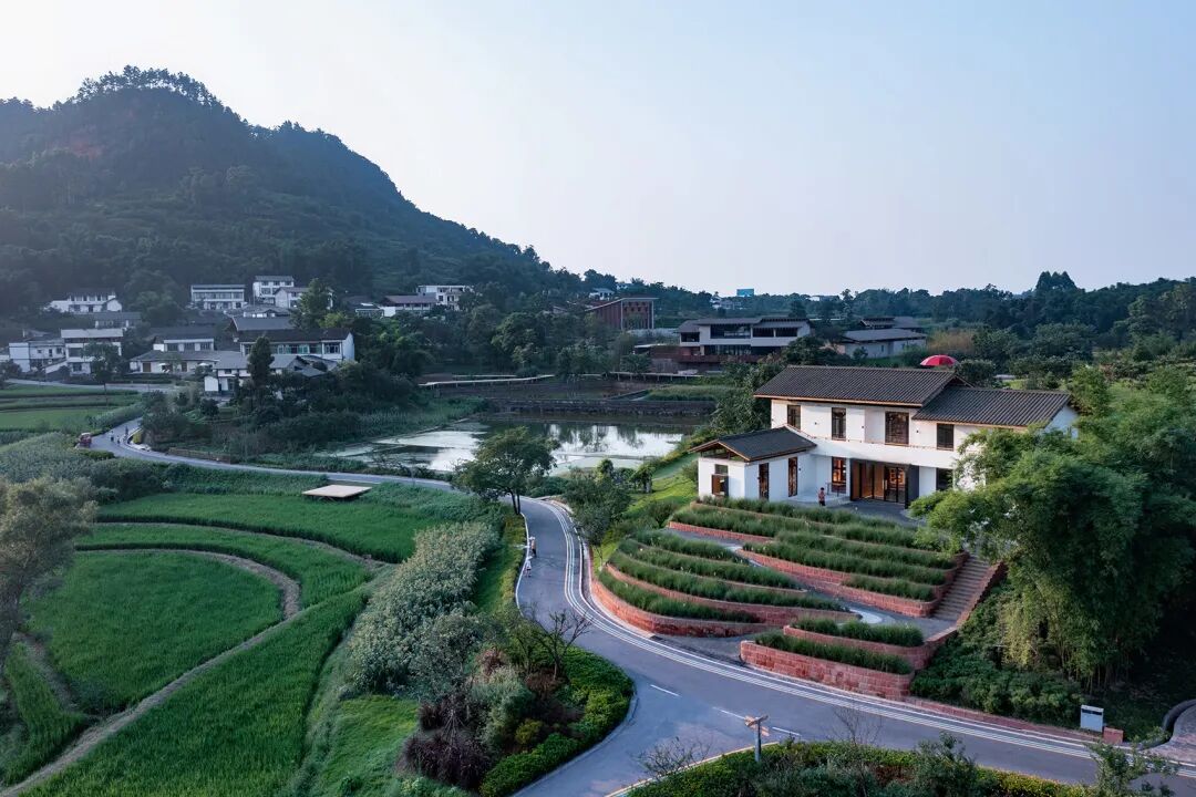 乡村书局位于安石村中心位置,三条道路交汇之处,场地与道路有4m的高差。建筑面对稻鱼共生区,建筑背后为开阔缓坡。