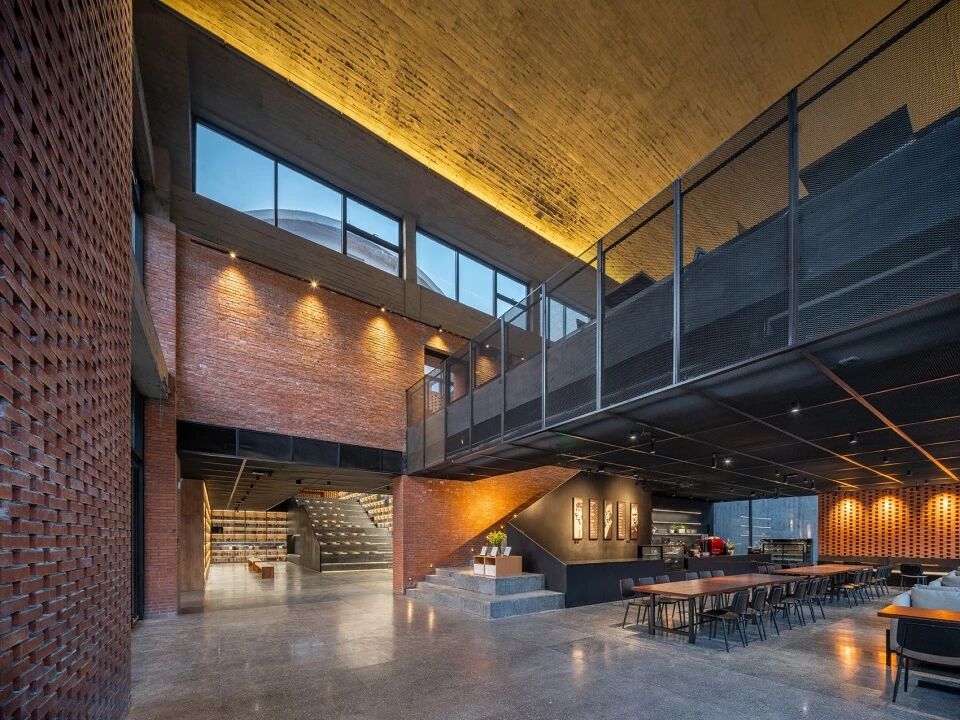 先锋汤山矿坑书店位于南京汤山矿坑公园内,原有砖窑呈现出一种“废墟”的美感,设计试图用“红砖+混凝土”的组合强化这种美学倾向。新建筑的墙身和场地的景观片墙采用红砖为主要的建筑材料来延续砖窑的质感,而拱则用混凝土浇筑而成,与矿坑公园山体上裸露的采石宕口相呼应。
