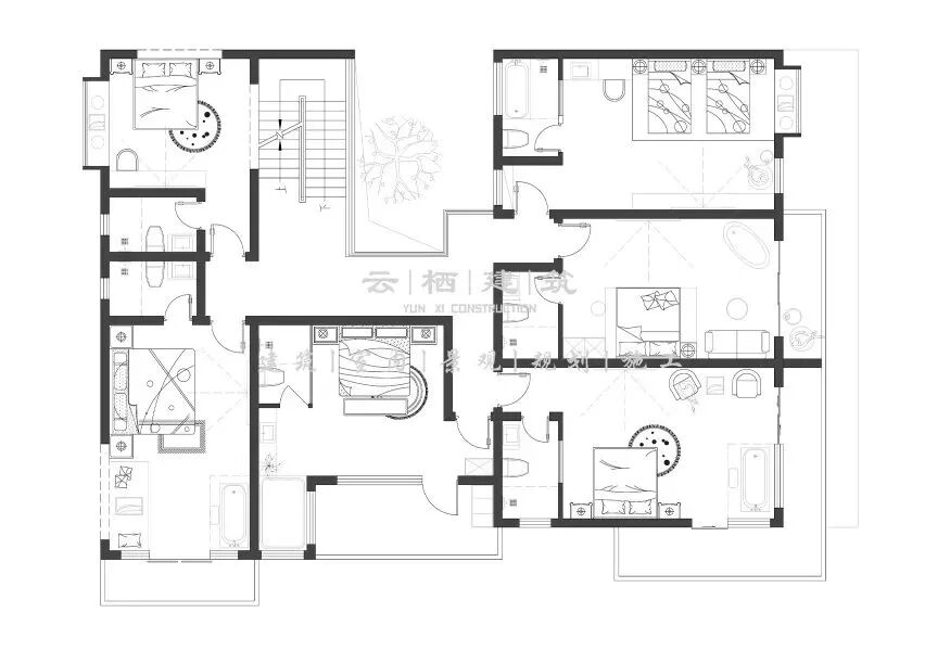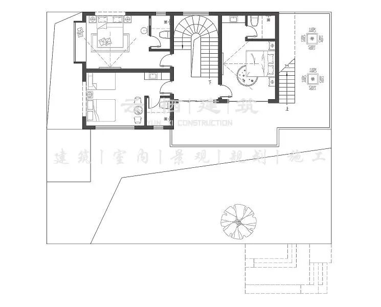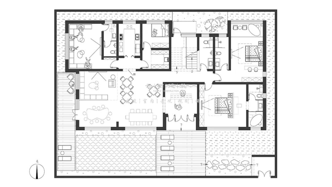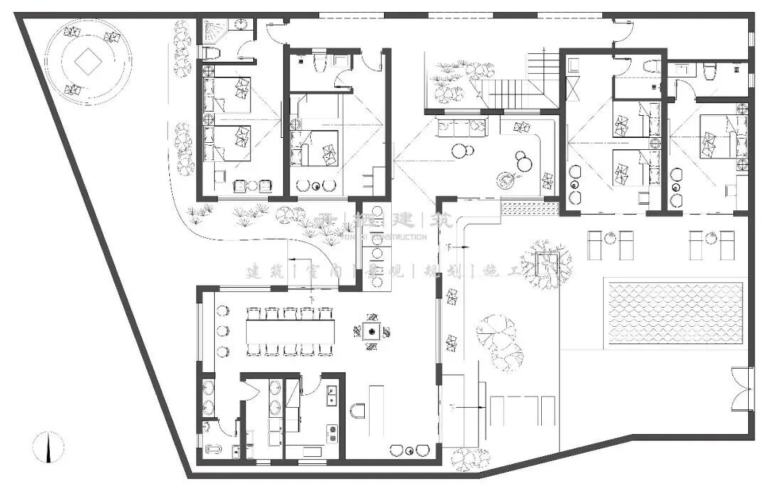 该项目位于北京平谷,是一个建筑面积近607.3㎡的诧寂风民宿项目。前期用作民宿经营,后期不做民宿时业主考虑分成两户自家使用,所以在功能配置和面积上尽量均衡,以现状的高差线作为分割。