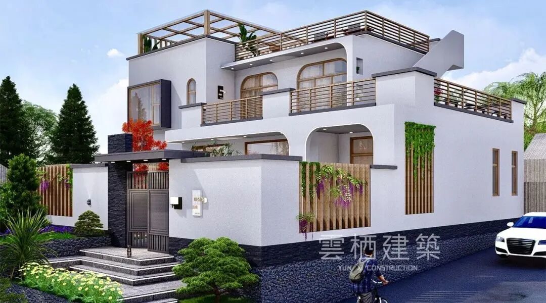 建筑整体为新中式风格,在传统中式神韵的基础上融入现代生活气息,打造一处专属国人的东方韵味民宿。栏杆、门窗、装饰构件和柱子全部采用原木色,增加温暖质感,外墙以白色真石漆为基底,局部点缀仿青砖面砖,渲染传统中式合院氛围。
