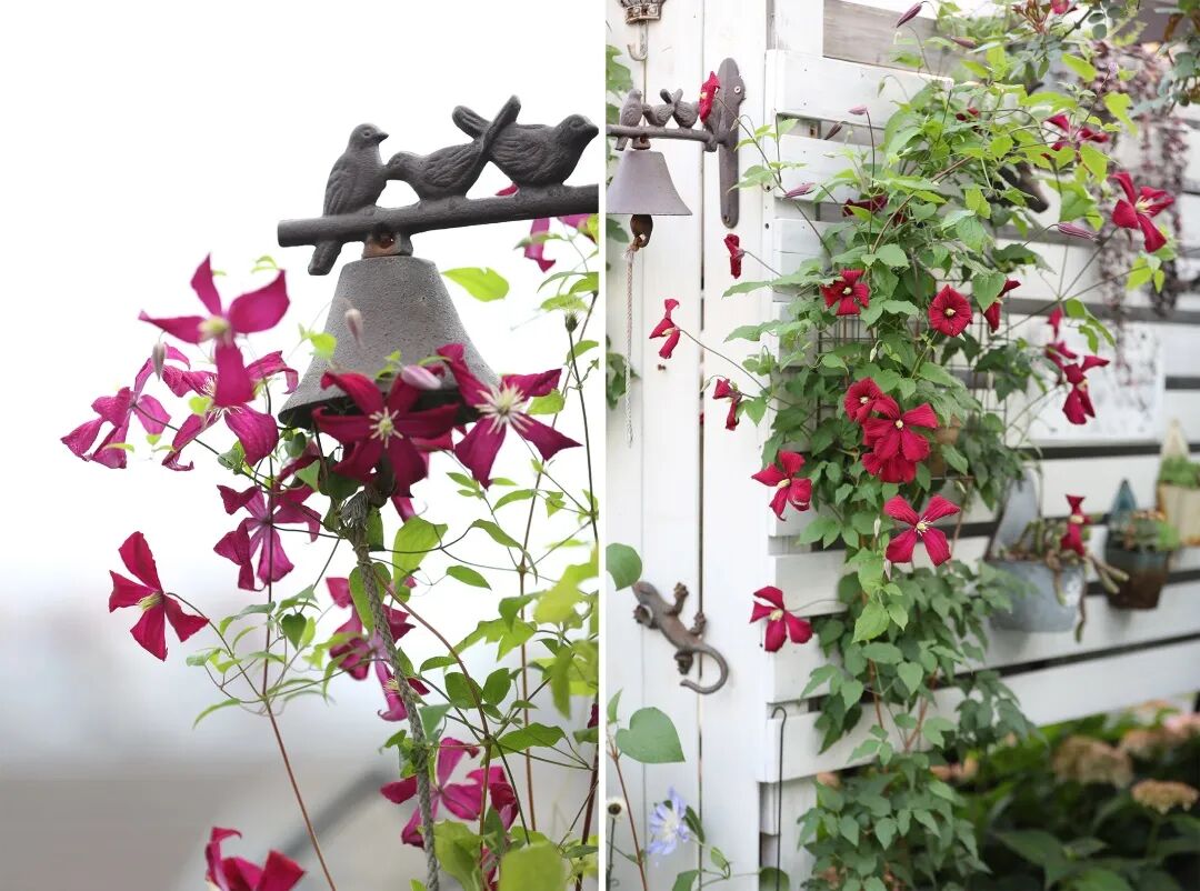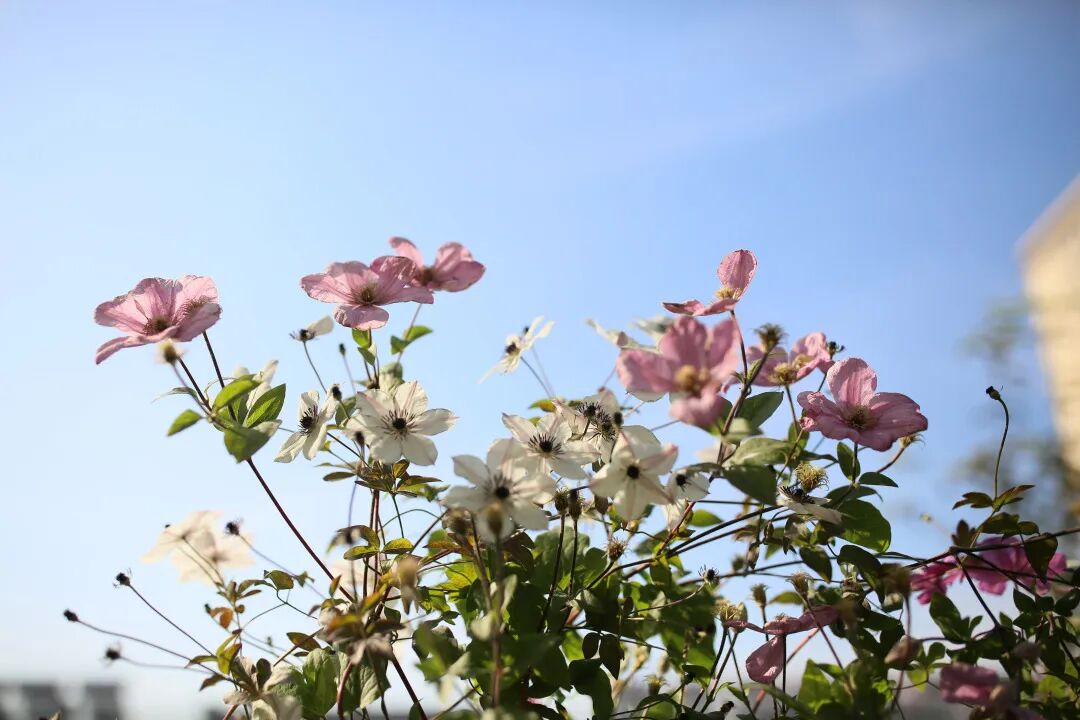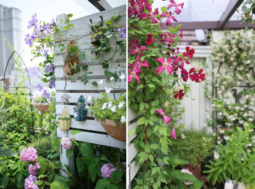 到了冬天,它的叶子会被风霜染红,弥补冬日花园的萧瑟。花园虽然小,但是因为露台上的采光和通风非常好,即使我疏于打理,甚少施肥,外围网格上攀缘着的铁线莲依然是花园里从早春到暮秋开得最欢快不知疲倦的花仙子。它们都在阳光下俏皮地向外探着脑袋,努力开出一片花墙给前面的邻居看。