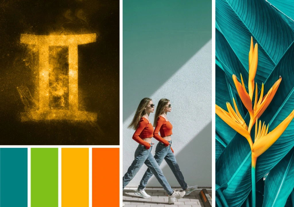 把黄色与其他乐观和热带色调相结合,如蓝绿色、柠檬绿和雅法橙,更能体现出双子座的双面反差性格。