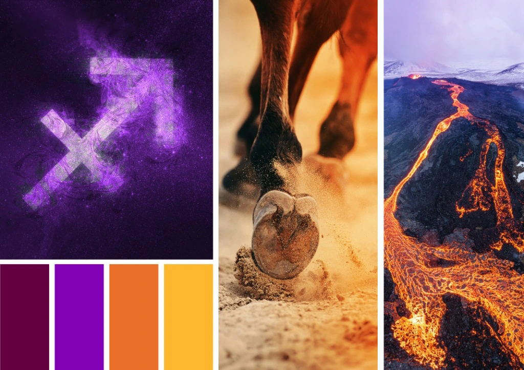 所以射手座的配色灵感是它本身标志的紫色,与熔岩的颜色(例如橙色和黄色)相结合,以彰显该星座的广阔和冒险性质。