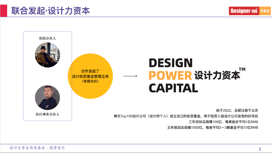 Designer100母基金,设计师设计力资本子基金,正在推进中,已经有30家著名设计公司签约加入,目前正在帮助他们成立设计师自己的投资基金。