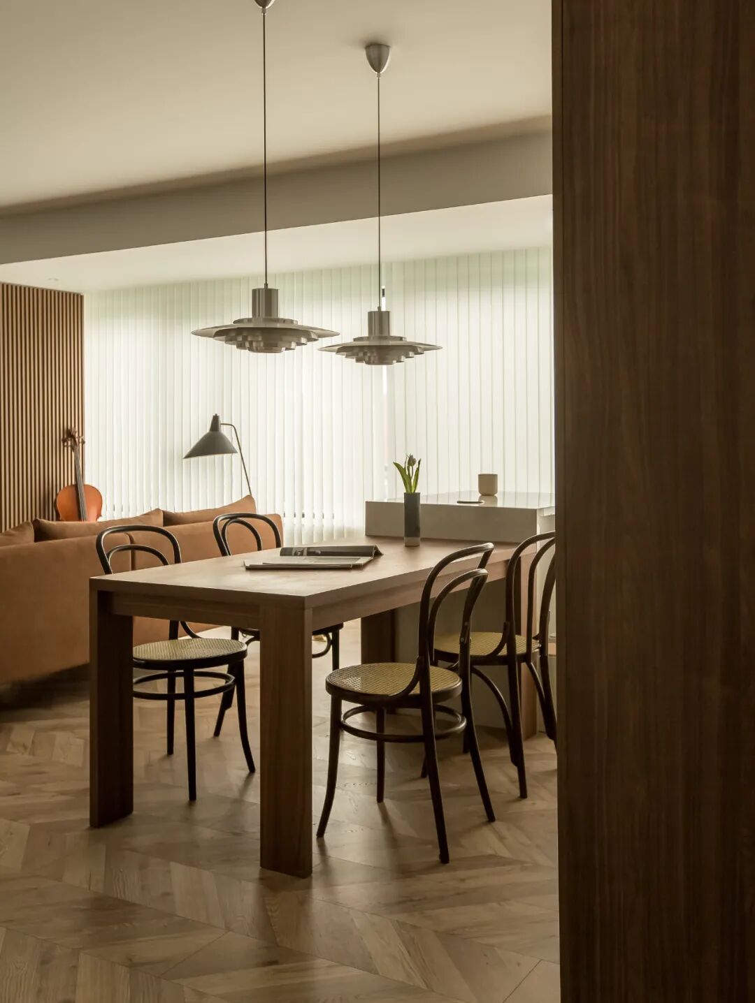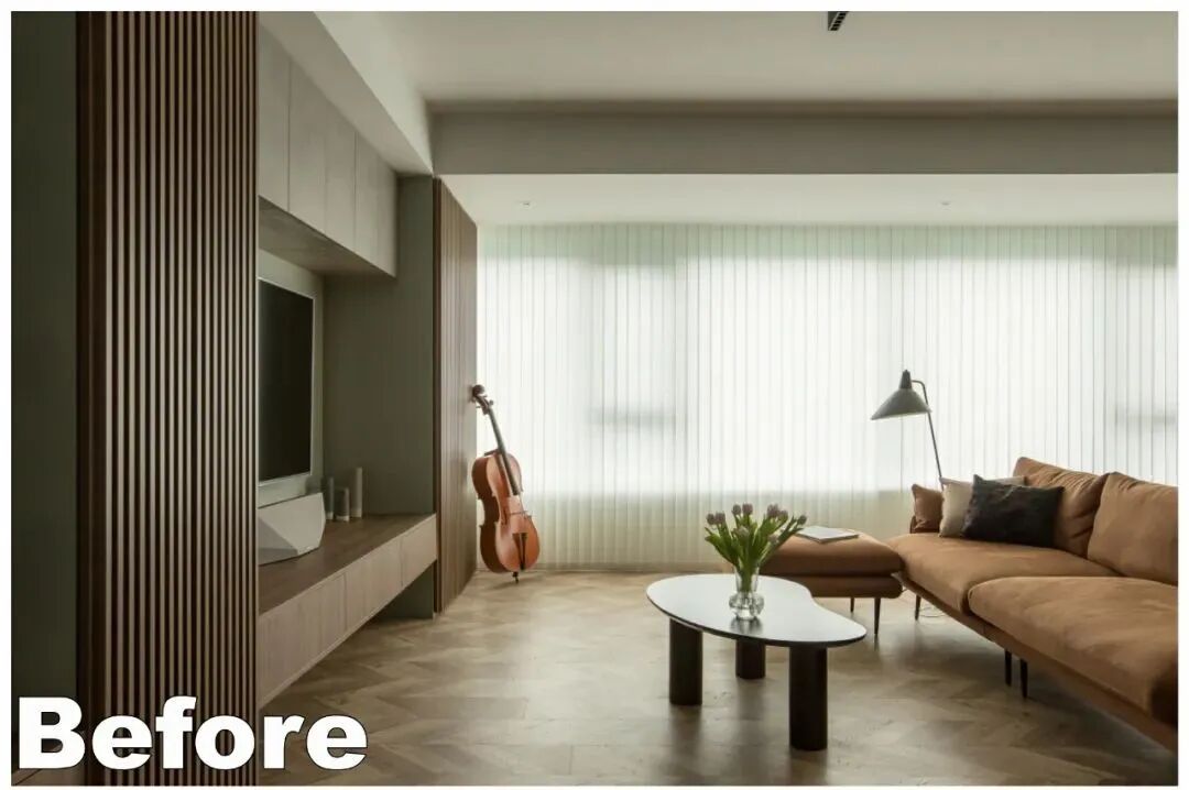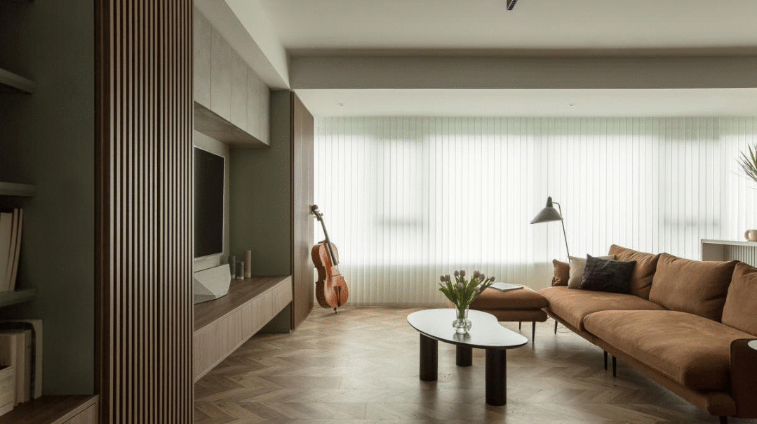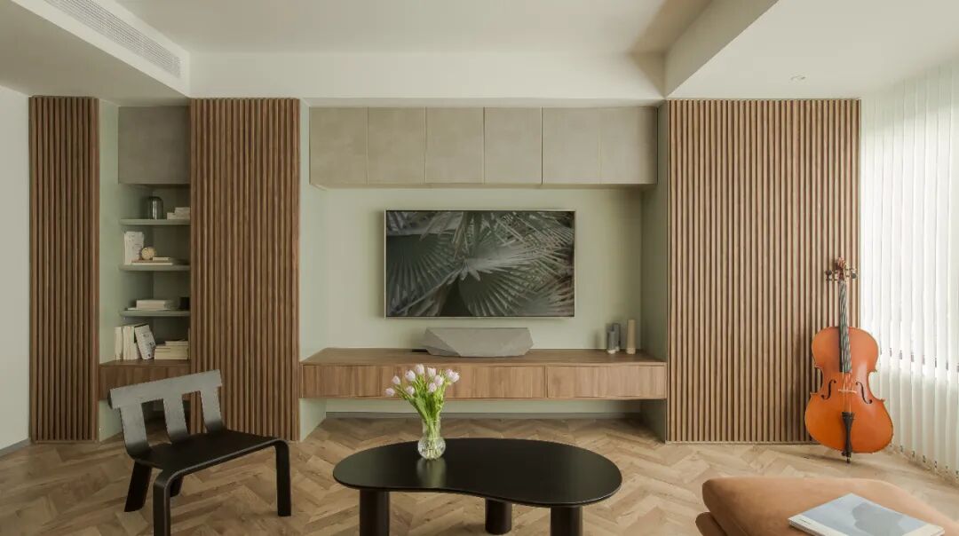 窗帘选择了垂直帘,和大面积的木格栅板相映成趣,入室的阳光形成的条纹光影,随日照方向在室内游动,音乐和阳光同时在家弥漫。