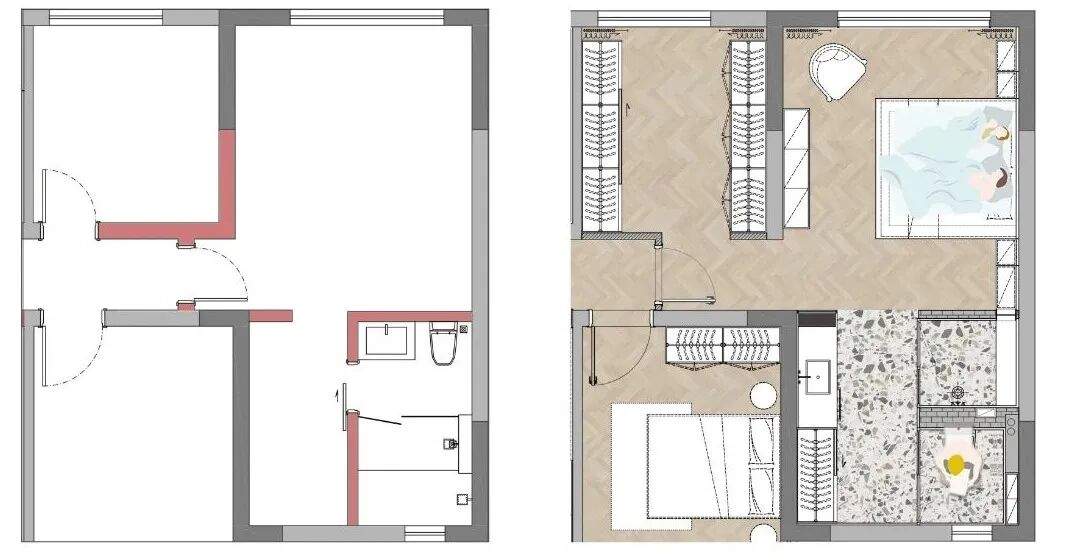 2. 后区靠近主卧的小房间并入主卧做独立衣帽间,调整房门位置,也缩短走廊的冗长感。