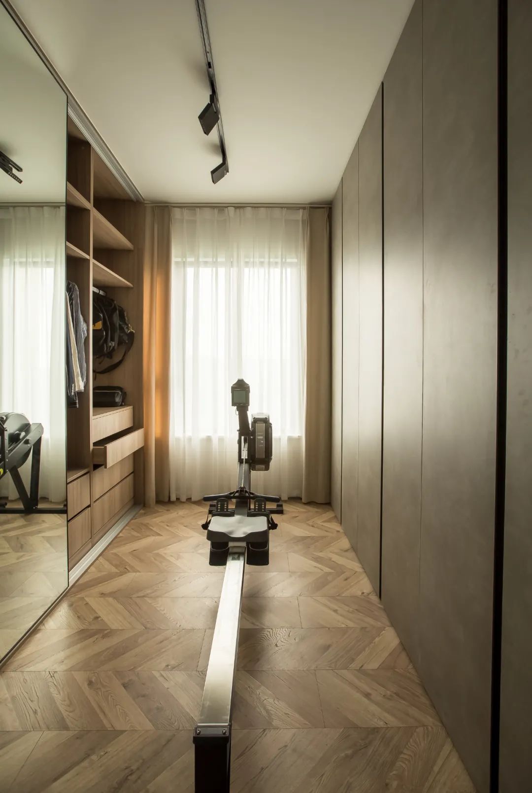 衣帽间定制了两排墙柜作为衣物收纳,并放置划船机,集衣帽间、健身房于一体的多功能空间,让空间使用更灵活。