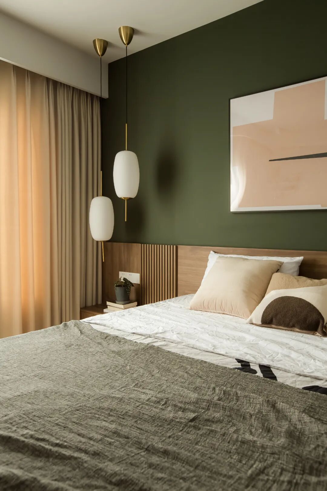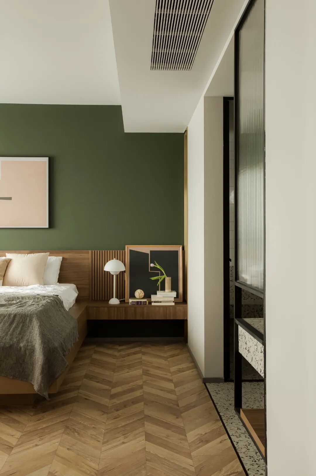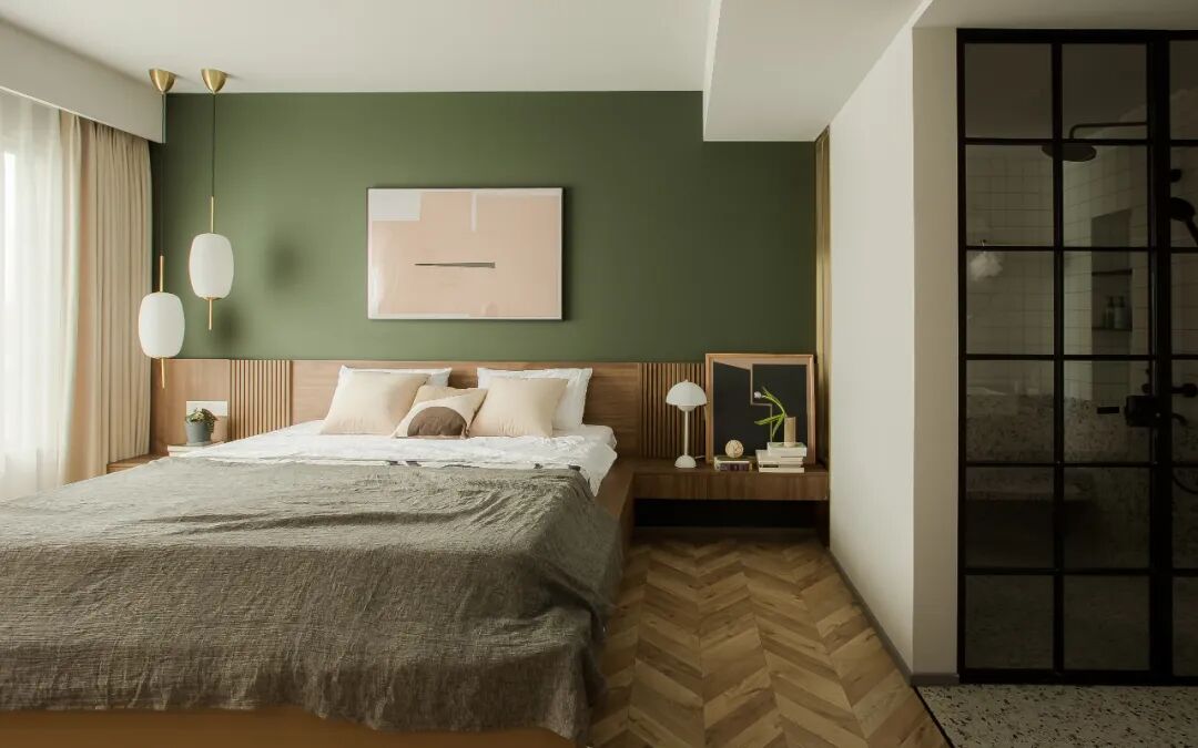 主卧使用了深绿色,如森林般深邃静涩,打造沉稳略带古典氛围的卧室空间。