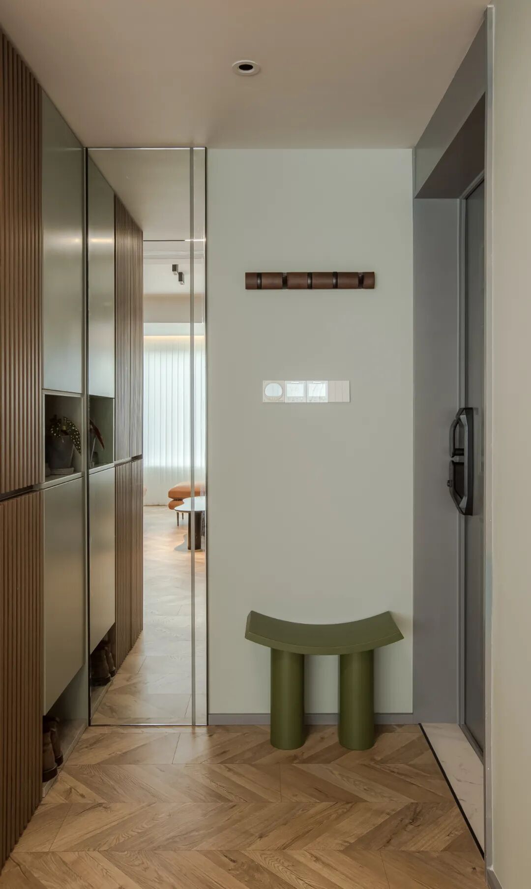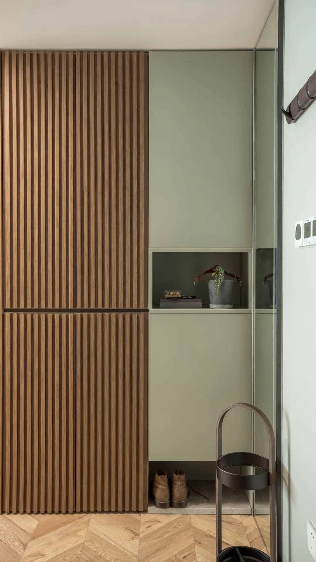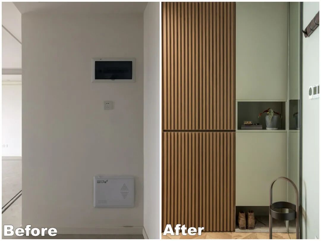 玄关定制了一面长1.3m的组合高柜,左边800公分落地柜,用木格栅板装饰,右边烟灰绿柜体中间和底部设置两个开架。