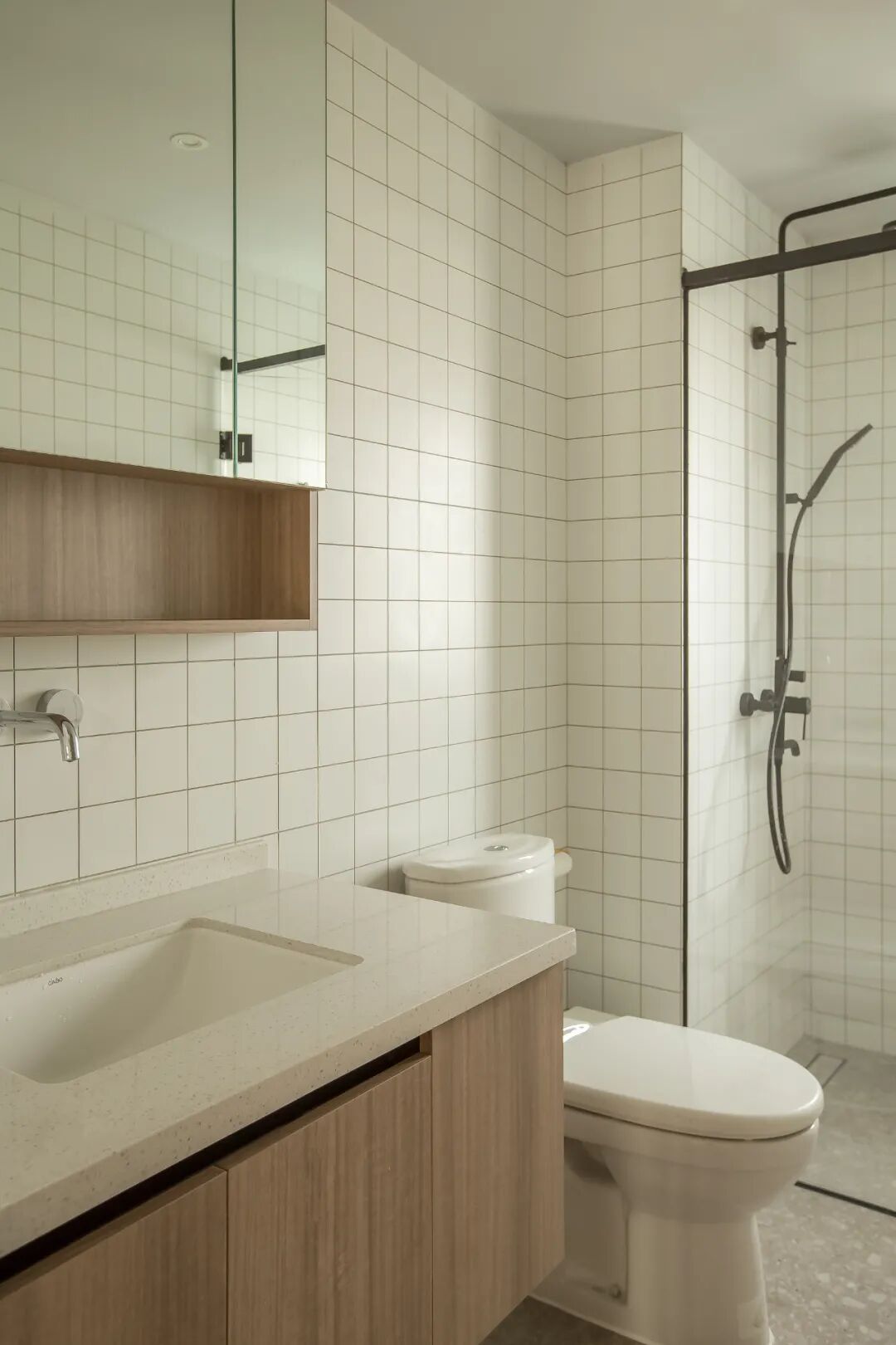 白色瓷砖墙面+灰色水磨石地砖搭配木色洗手台面,空间显得祥和,让沐浴时光变得宁静、安心。