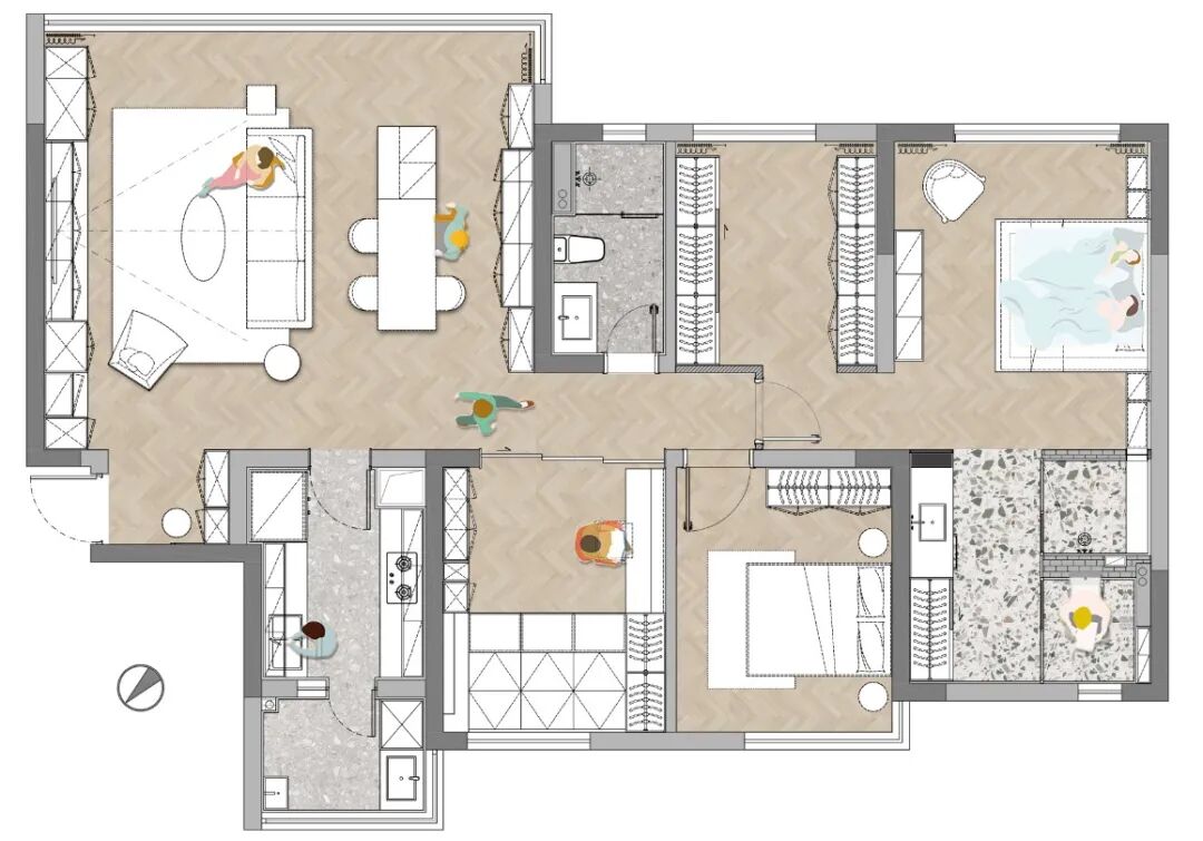 走廊靠里的两间卧室合并成一间,做成主卧套房,装下了衣帽间和三分离的卫浴间,也减少了走廊冗长的感受。