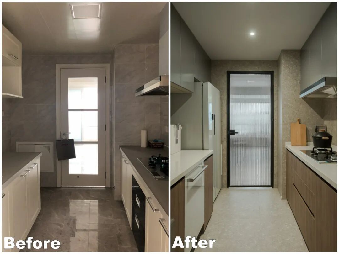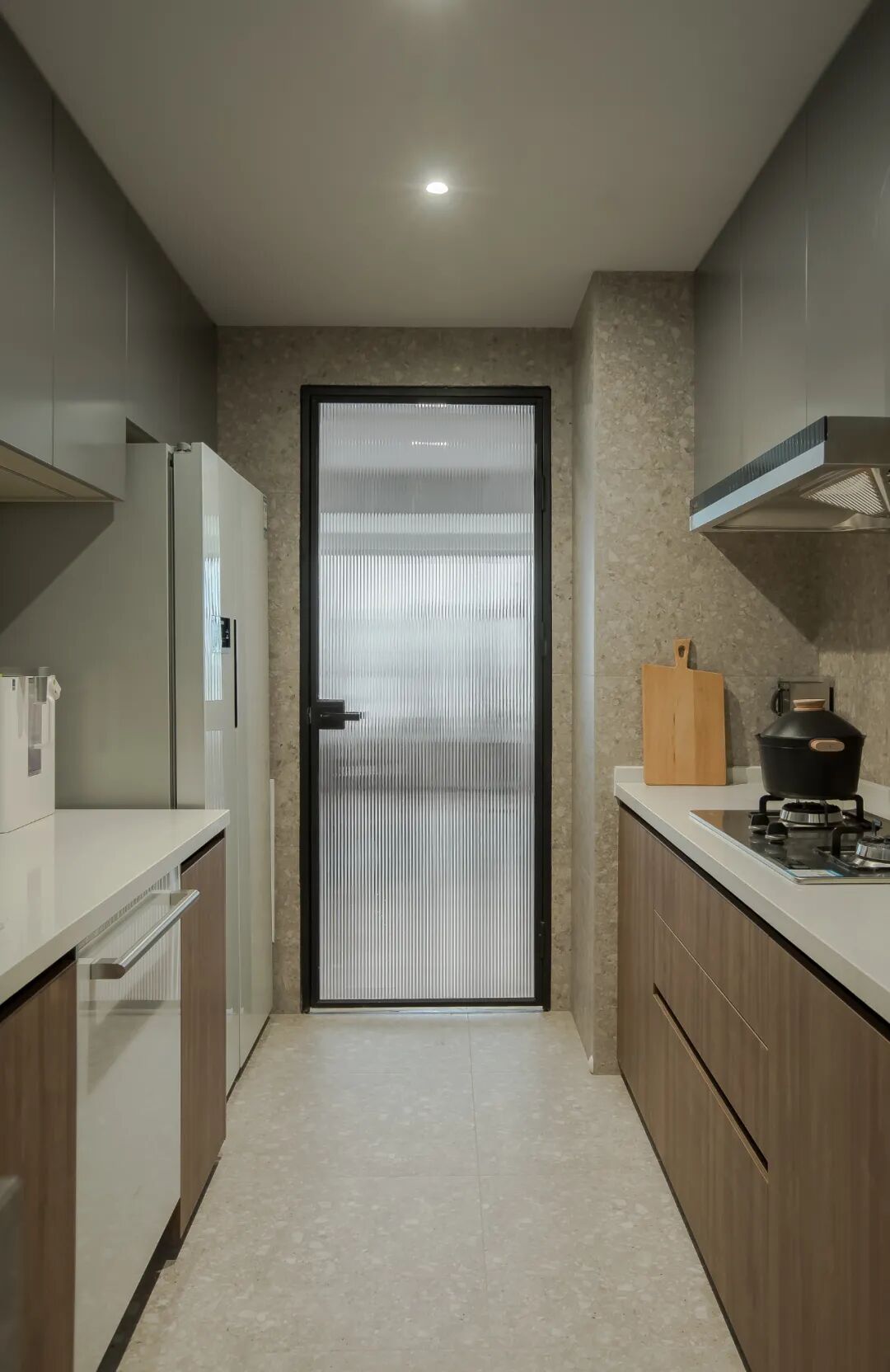 厨房空间的墙地都使用了同款水磨石砖,使空间更加整体简洁,弱化空间狭长的感受,同时木色柜体带出家的温暖气息。