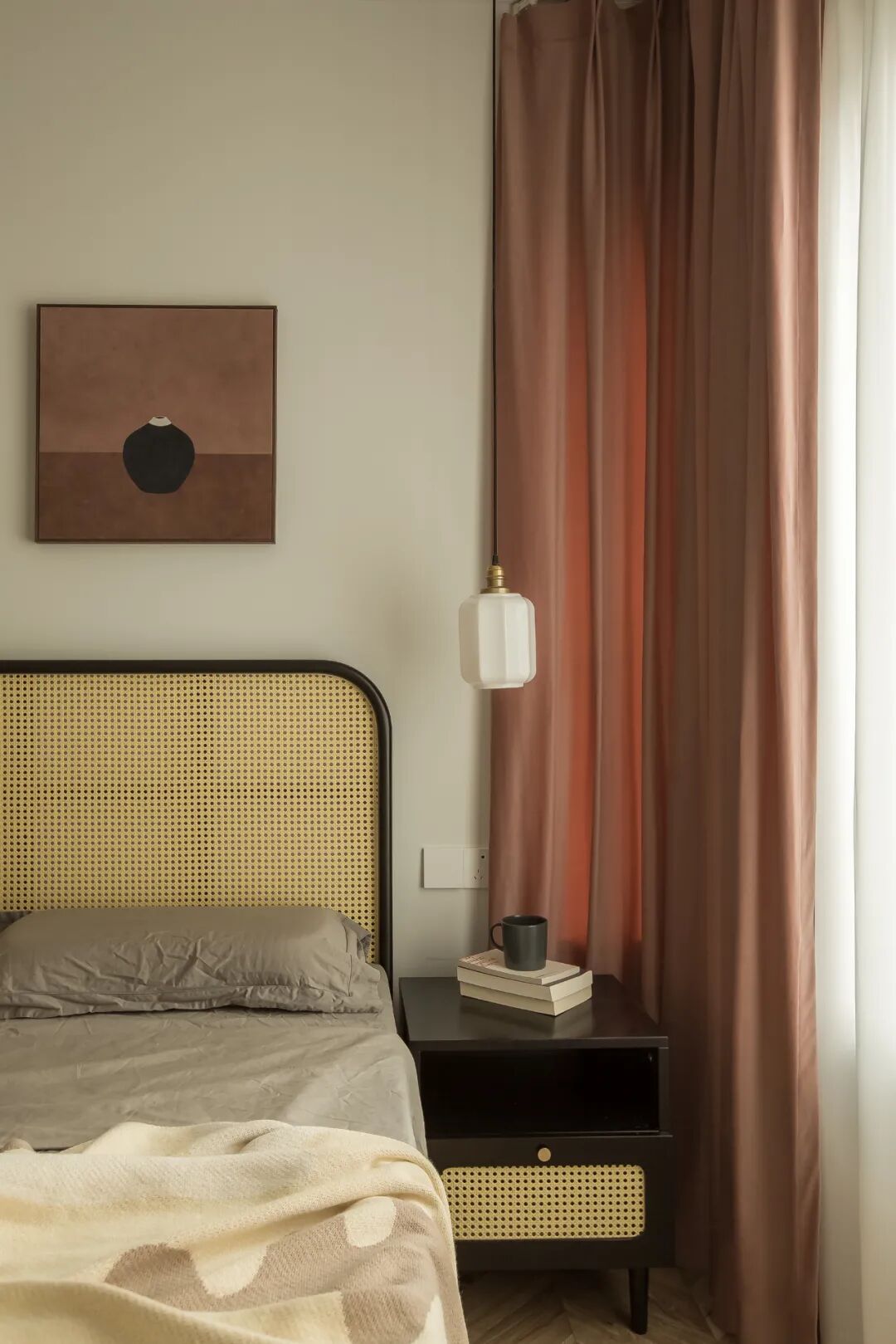 复古的小吊灯,棕粉色的布帘搭配墙面画作,角落风光简单却甜美。