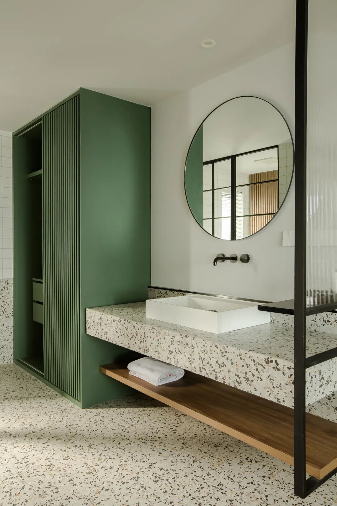 我们在淋浴房墙面开了落地窗,让主卧的光线也能延伸到淋浴房,提亮空间增加其通透性。