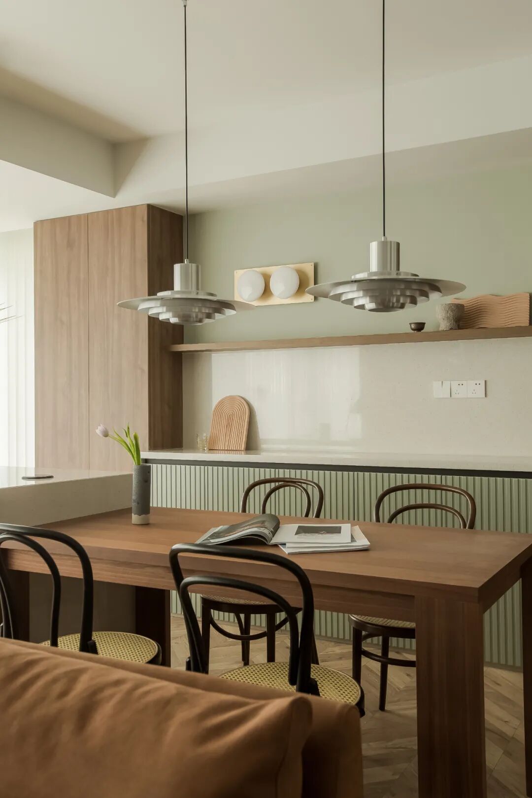 餐桌旁边设置了双高柜+餐边柜组合,双高柜可以实现餐区所需收纳,餐边柜则能担当迷你酒水吧和简单料理的操作平台。