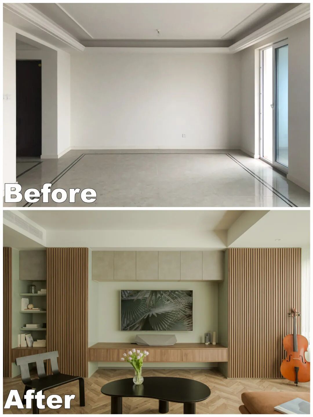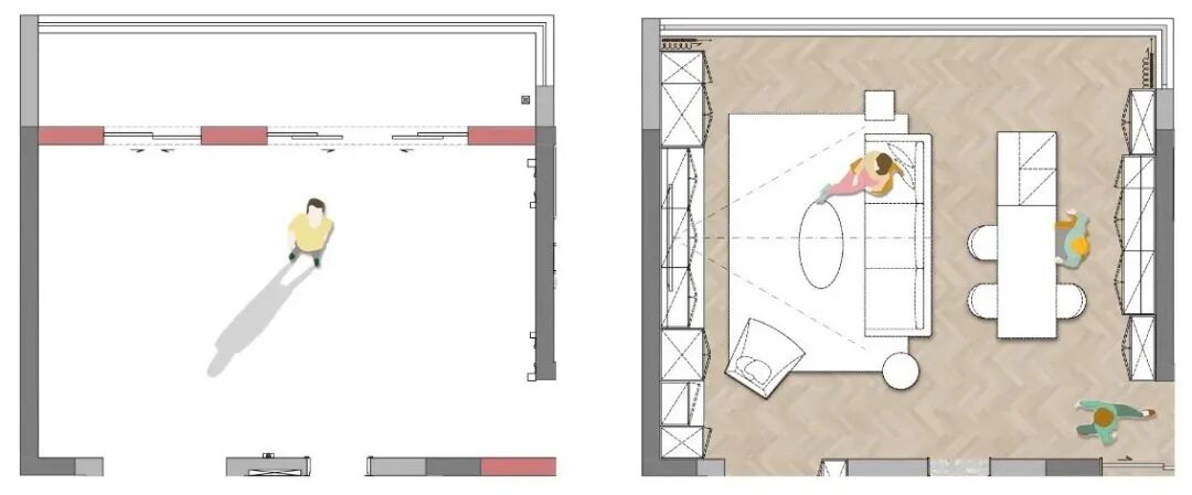 电视墙形成内退的结构,并利用内退空间定制了一整排深度60公分的收纳柜,增加空间的可延续使用性。