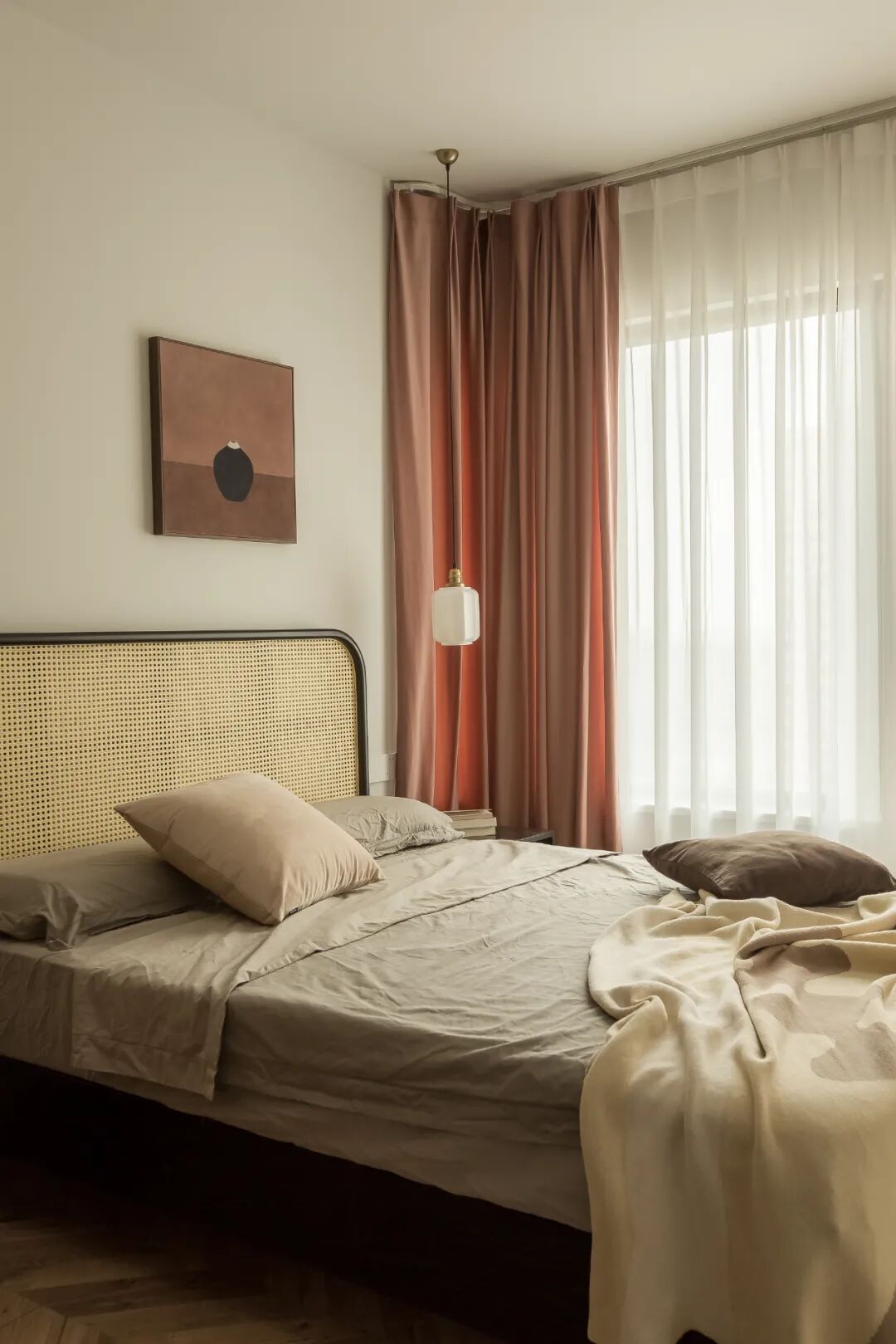 次卧是为屋主爸妈偶尔来小住准备的,床调整到了1.55m的宽度,藤编的床靠透气有弹性,搭配米灰色墙面营造全然放松的休憩空间。