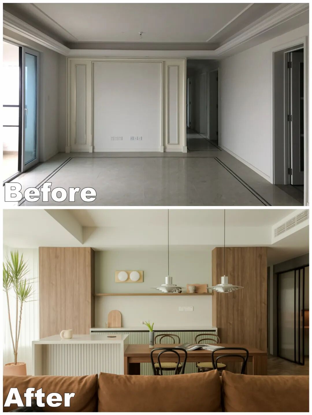 我们将阳台与室内进行连通,公区获得一整面玻璃幕墙,也拥有了整屋最好的采光和视野。