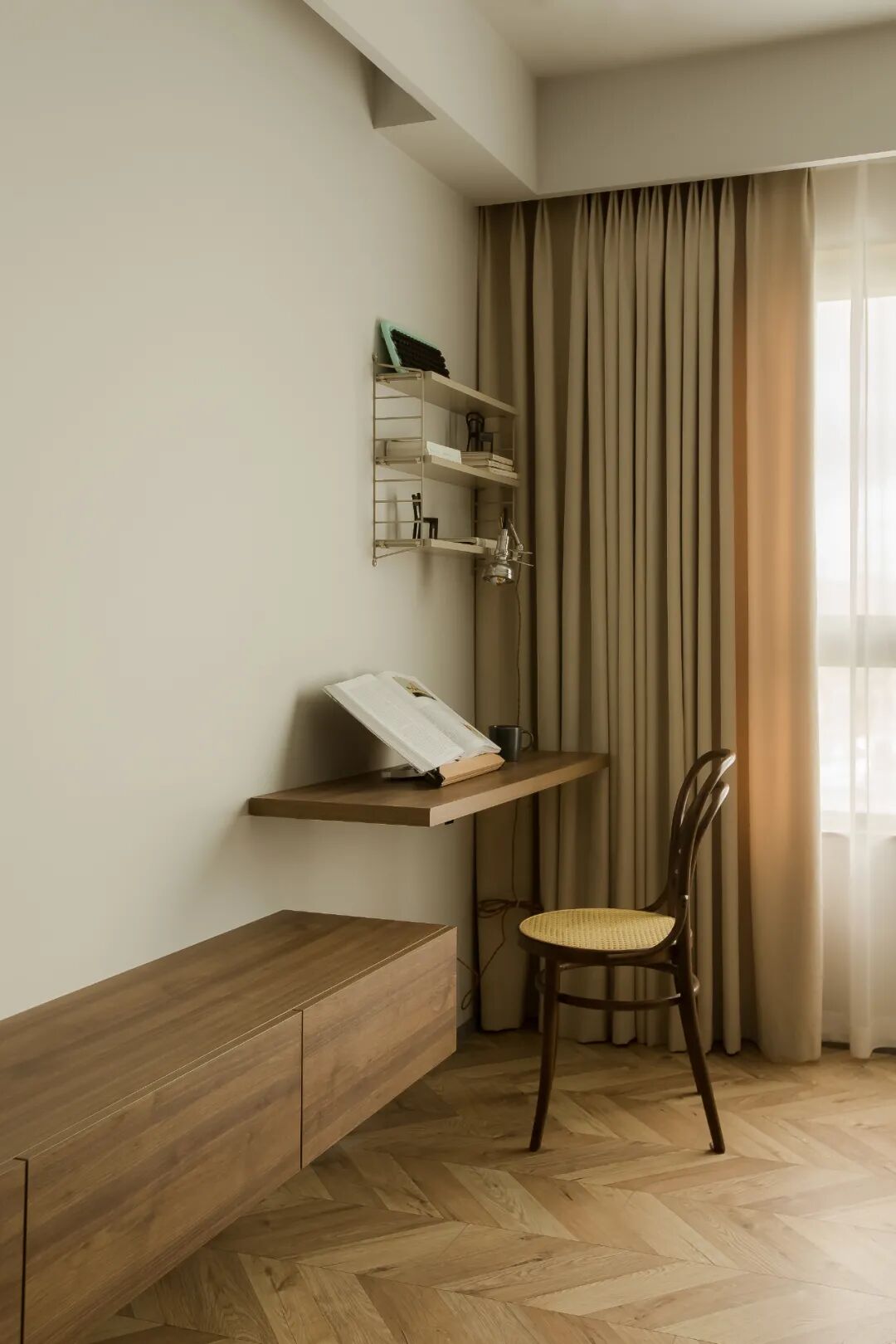 床尾空间比较宽裕,我们定制了电视柜+小书桌一体的家具组合,用搁板+string弦架在角落设计了一处阅读角。