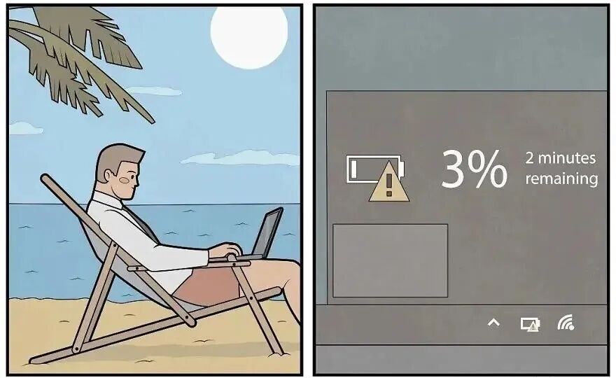 11、当你坐在阳光沙滩美景之中,准备工作时,电脑总会提示你电量不足。