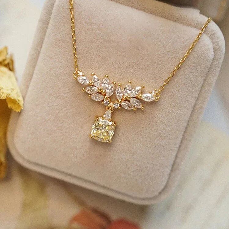 S925纯银镀金链条,水钻组合成两片叶子的形状,叶子之下是一颗正正方方呈金黄色的锆石,唯美却尽显名媛风尚,与晚装搭配端庄大气。
