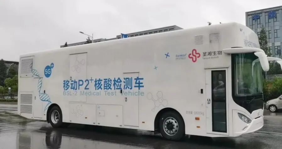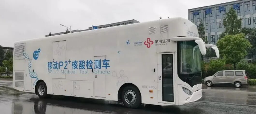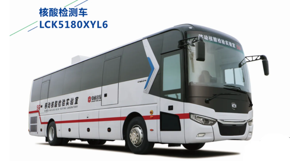 在中通客车的产品型谱中,目前已经实现批量销售的有12米、13米两款核酸检测车。这两款车型部达到P2+生物安全实验室标准,其核心就是医疗专用空气调节系统,并且具备了随采、随检、随上报的功能。具体来看,核算检测车需要搭载高效新风过滤系统、医疗给排水系统,全自动PCR分析系统并具备5G信号传输能力。据相关数据显示,中通汽车旗下的13米核酸检测车检测能力可达1万管,按照10:1的混检标准,每天可检测10万人次。