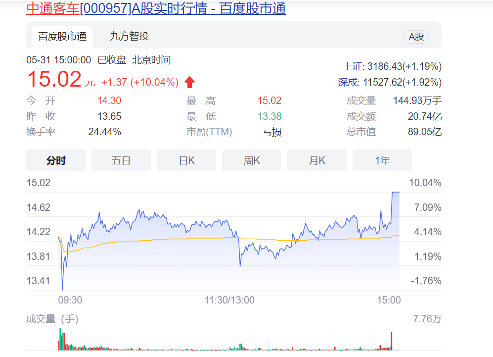 5月31日,头顶“核酸检测车”概念股的中通客车再度涨停,以15.02元报收,公司总市值接近90亿元。这是中通客车自5月13日起,连续收获的第13个涨停板。那究竟是什么样的公司,能够得到资本的如此青睐?
