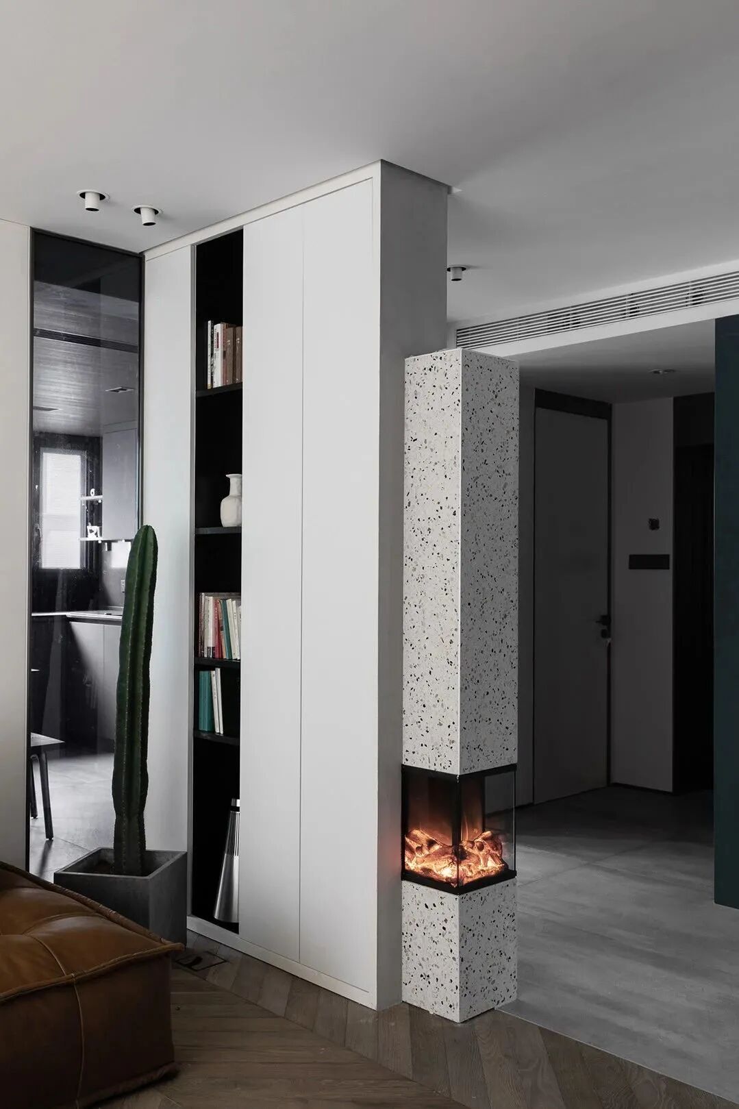 ▲玄关壁炉造型后方的是客厅区域,边几装个书架,布置仙人掌,也是显得更加文艺高档。