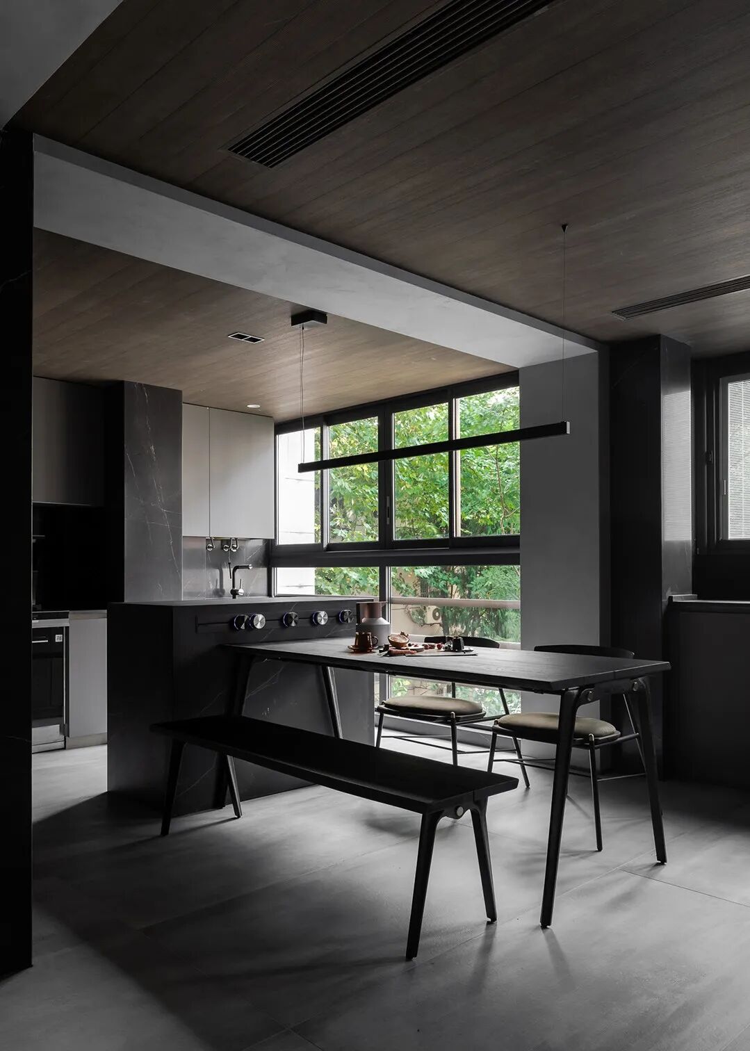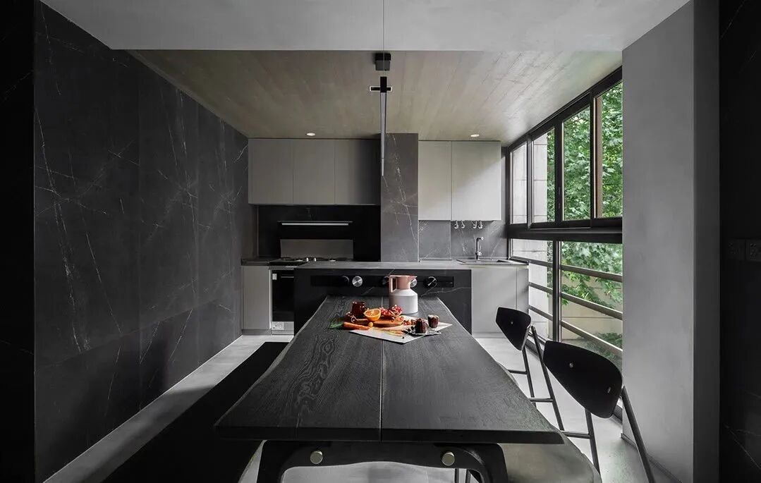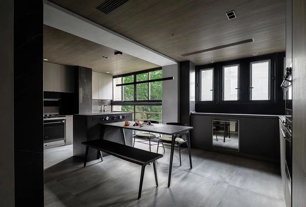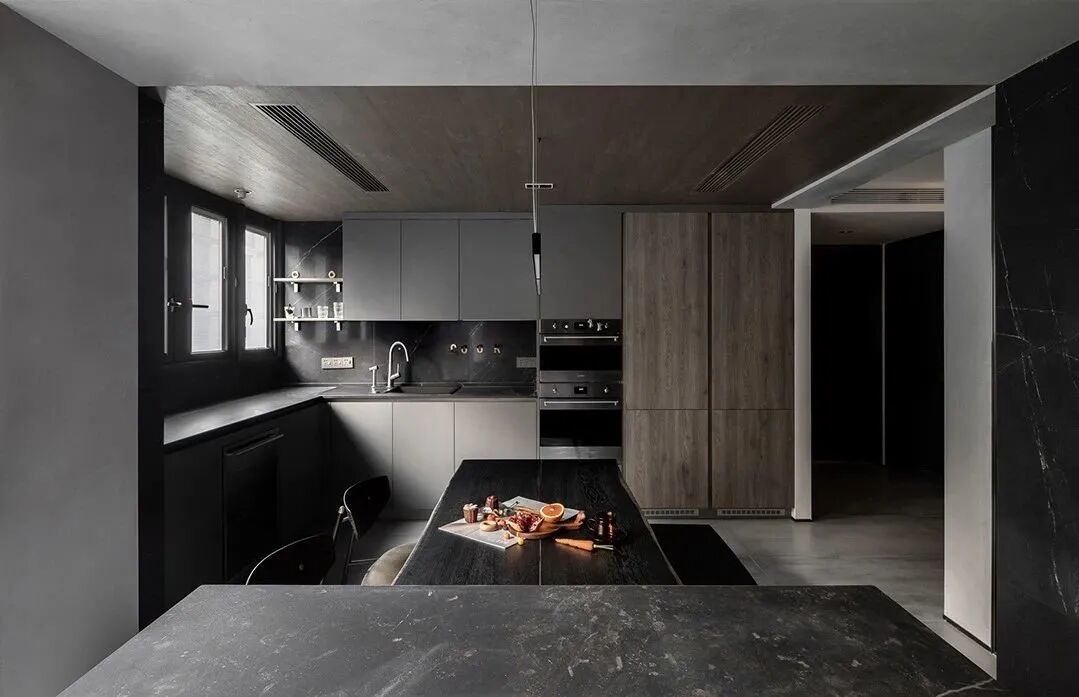 ▲餐厨区以深色的的空间为主,彰显出一种低调的高级与品质感。