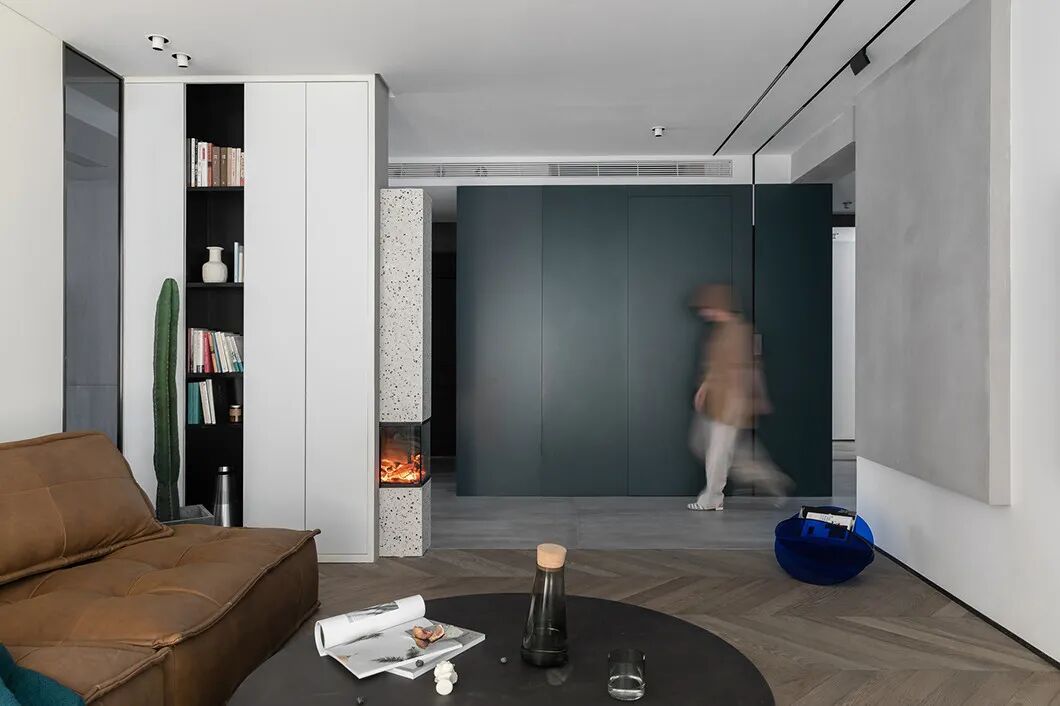 ▲正对大门位置以水磨石质感+灰色的叠级设计墙面,墙体后方加入暗藏灯带设计,让空间更加有层次感,装上壁炉后,一开门就看到了一个文艺而热情的空间感。