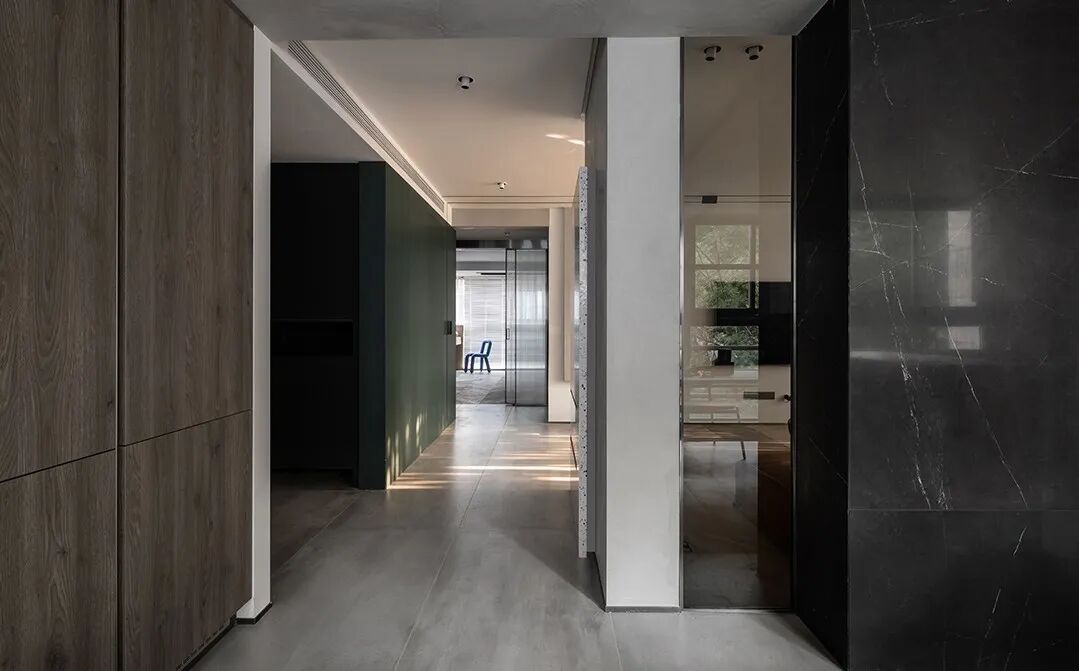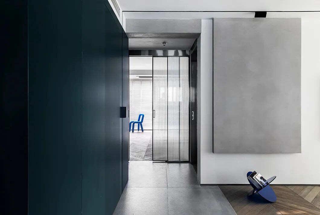 ▲过道深蓝色的墙后方是储物间,而过道另一端则是餐厨区,整个空间连贯的分离,让生活更加有乐趣。