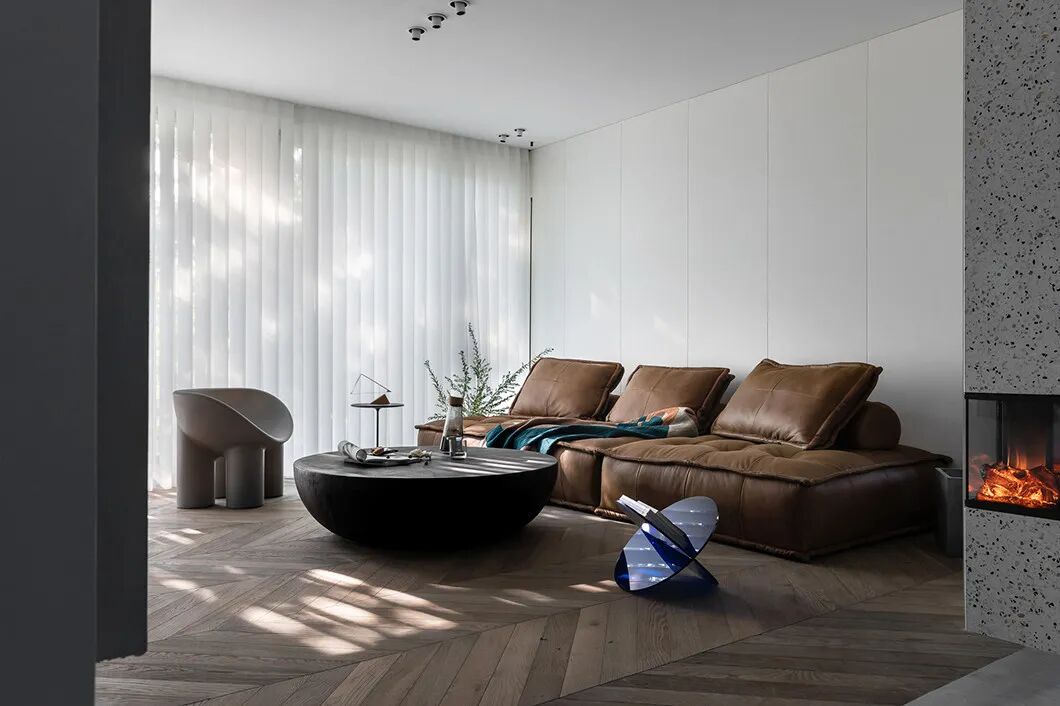 ▲棕色皮沙发,沙发后是白色的极简饰面板背景墙,极简空间+稳重范的家具,也是显得更加优雅高级。