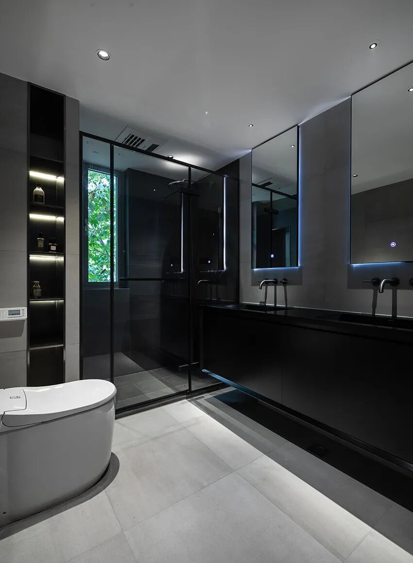 ▲黑色与灰色结合的卫浴空间,再加上光源的设计,让空间显得更加神秘高级。