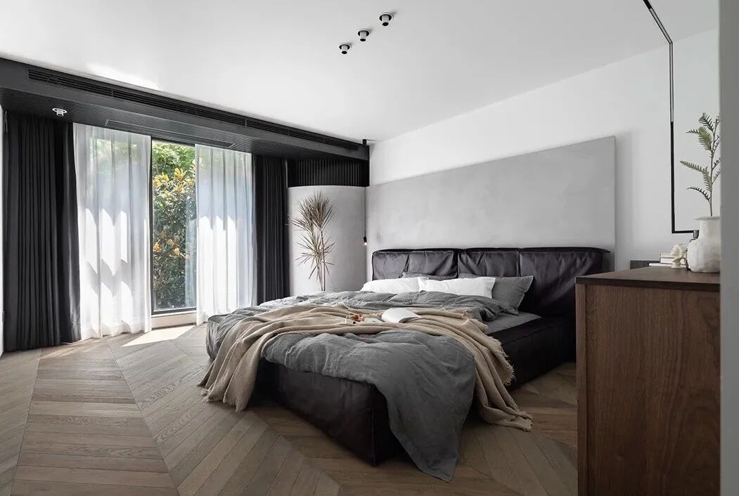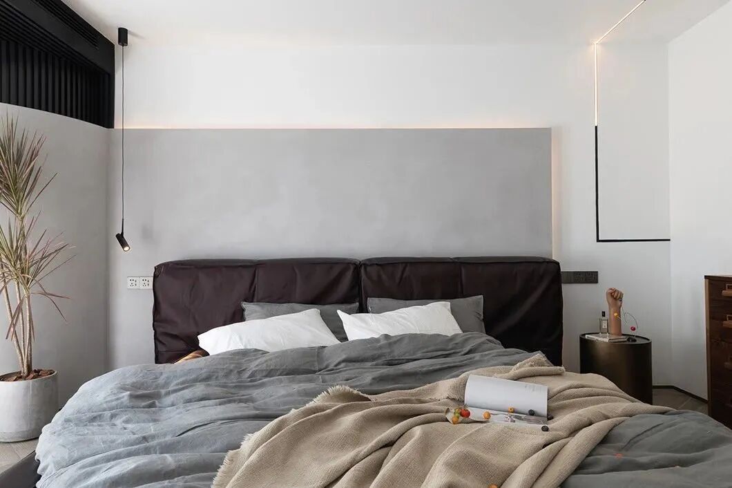 ▲极简风的卧室也是采取无主灯的设计,床头墙是白色背景墙+灰色的造型,显得极简高级而有层次,人字铺的木地板,灰白配的窗帘,灰色皮艺床布置灰色床单,床头两侧加入绿植的装饰,也增添了空间的清新与活力气息。