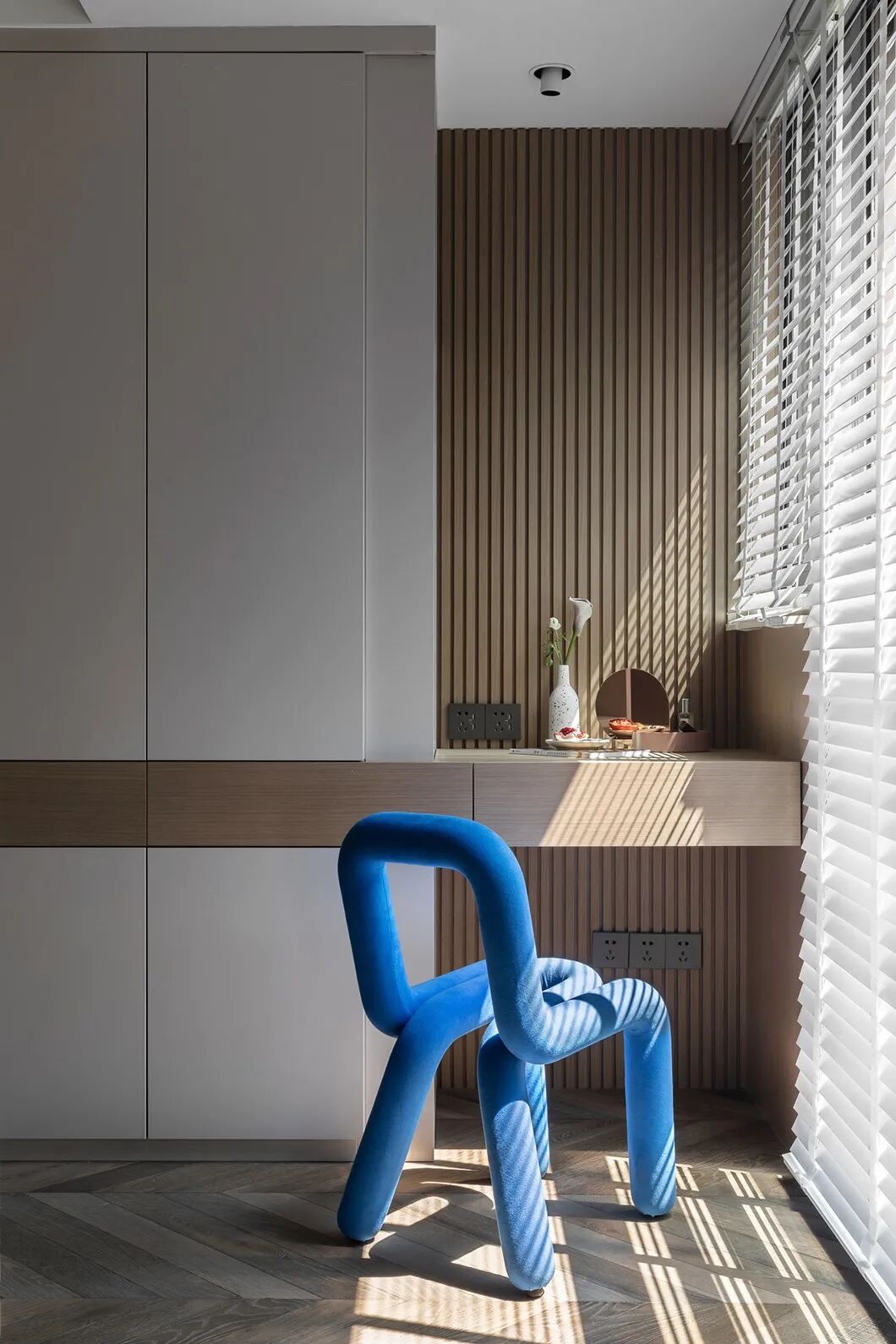 ▲这个空间有着衣帽间、梳妆台与休闲功能,窗户也百叶帘的设计,布置一张造型独特的蓝色椅子,也让空间显得更加情趣。