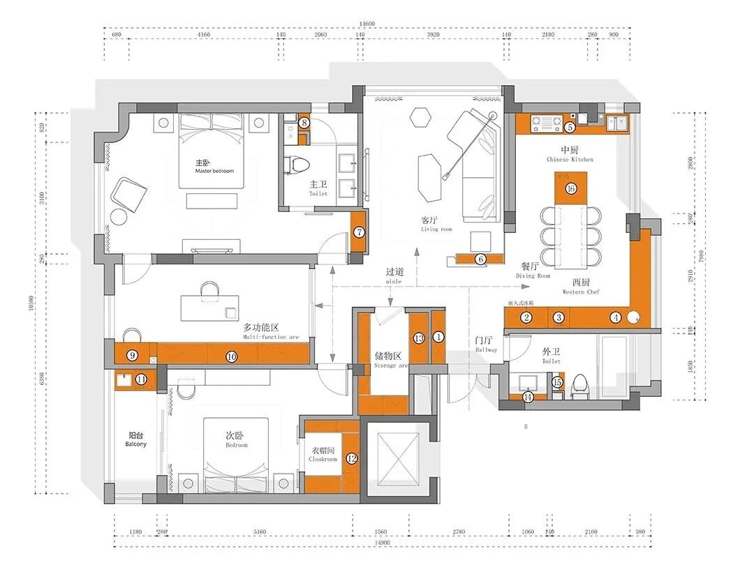 ▲餐厨一体的空间,在两端设置操作台,中间布置中岛台+餐桌,营造出一种宽敞而情趣的餐厨体验,把餐厅与厨房放在一起,提升了烹饪生活的乐趣感。