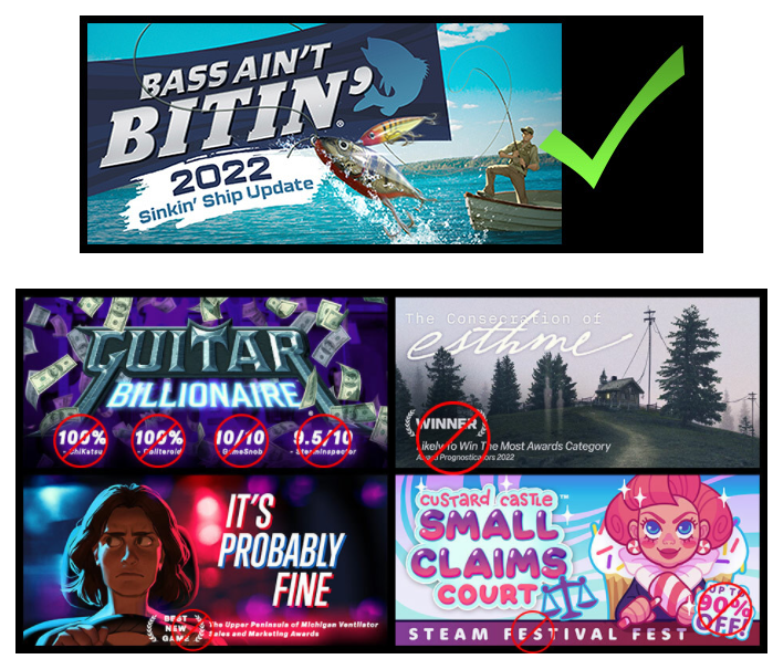 Steam官方于近日公布了一项图像资产宣传图新规则。该公司表示他们之前的相关指引不够清楚,导致游戏开发者在图像资产中加入过多的文字、奖项徽标和游戏评分,给玩家带来了困惑,甚至会造成不准确的认知。为了让开发者能够准确向玩家传达游戏相关的信息,也为了确保指引内容尽可能清楚地说明图像资产上应该和不应该包含的内容。9月1日起,该项规则开始正式实施,Steam商店上架的所有游戏使用的宣传图都禁止包含评分和营销类文字。