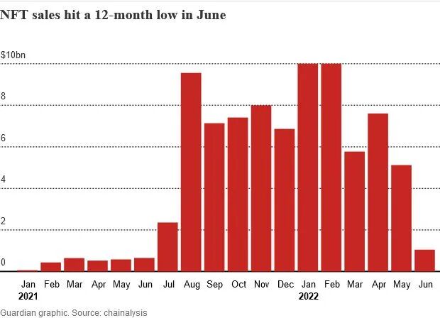 据NFT数据研究公司CryptoSlam的数据,NFT市场月销售额首次跌破10亿美元,这是自2021年6月以来NFT销售额最惨淡的一个月。今年年初,其峰值曾达到126亿美元。比特币以及其他加密货币的价值在过去一年中暴跌,原因之一是人们意识到它是一种有风险的投资。而各国频繁加息和通货膨胀的上升也加速了这种下跌趋势。Chainalysis经济学家Ethan McMahon在接受《卫报》采访时表示,NFT销量的暴跌肯定与加密货币市场的广泛放缓有关,该市场的价值已从2021年11月的约3万亿美元跌至不足1万亿美元。