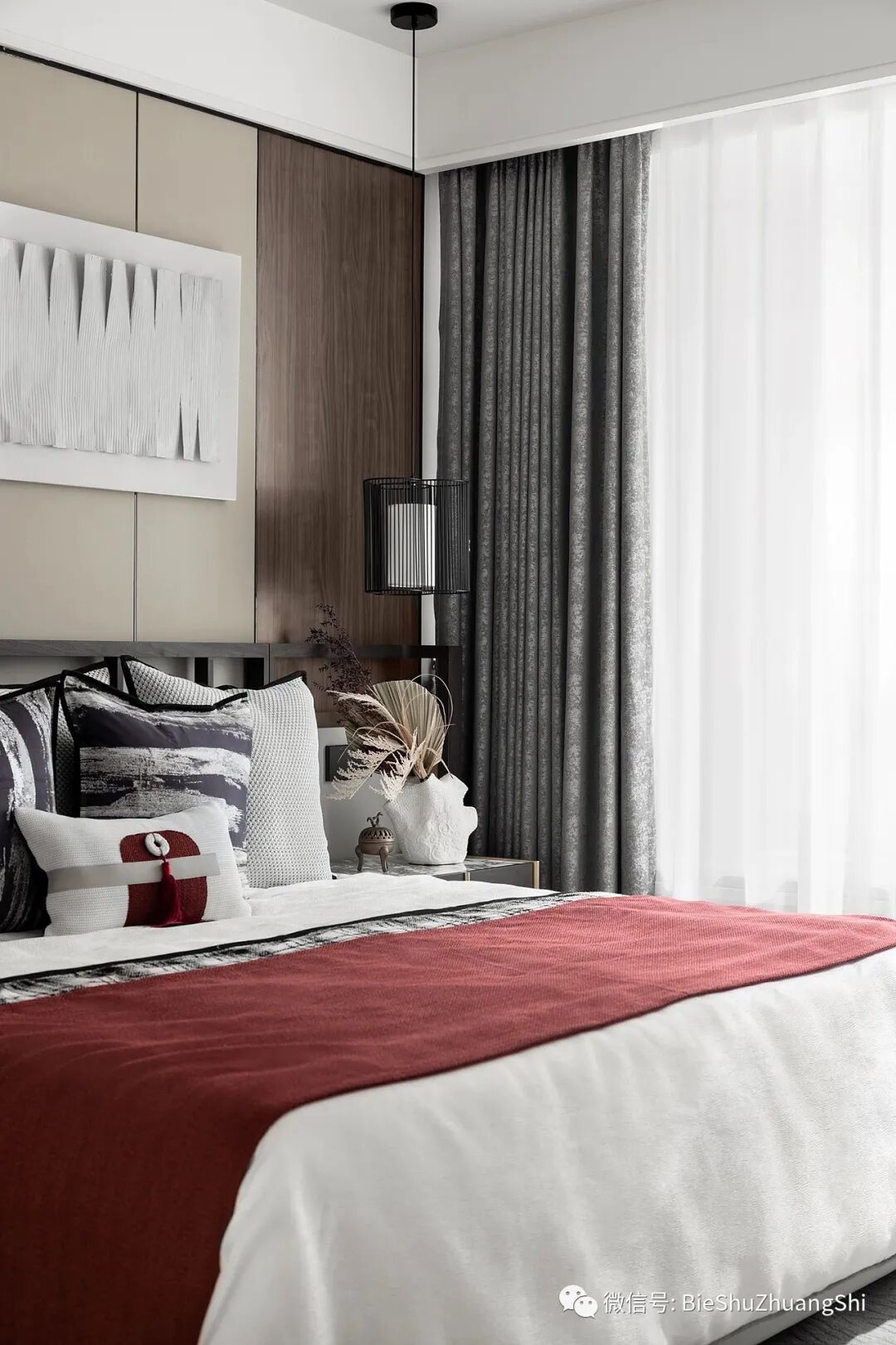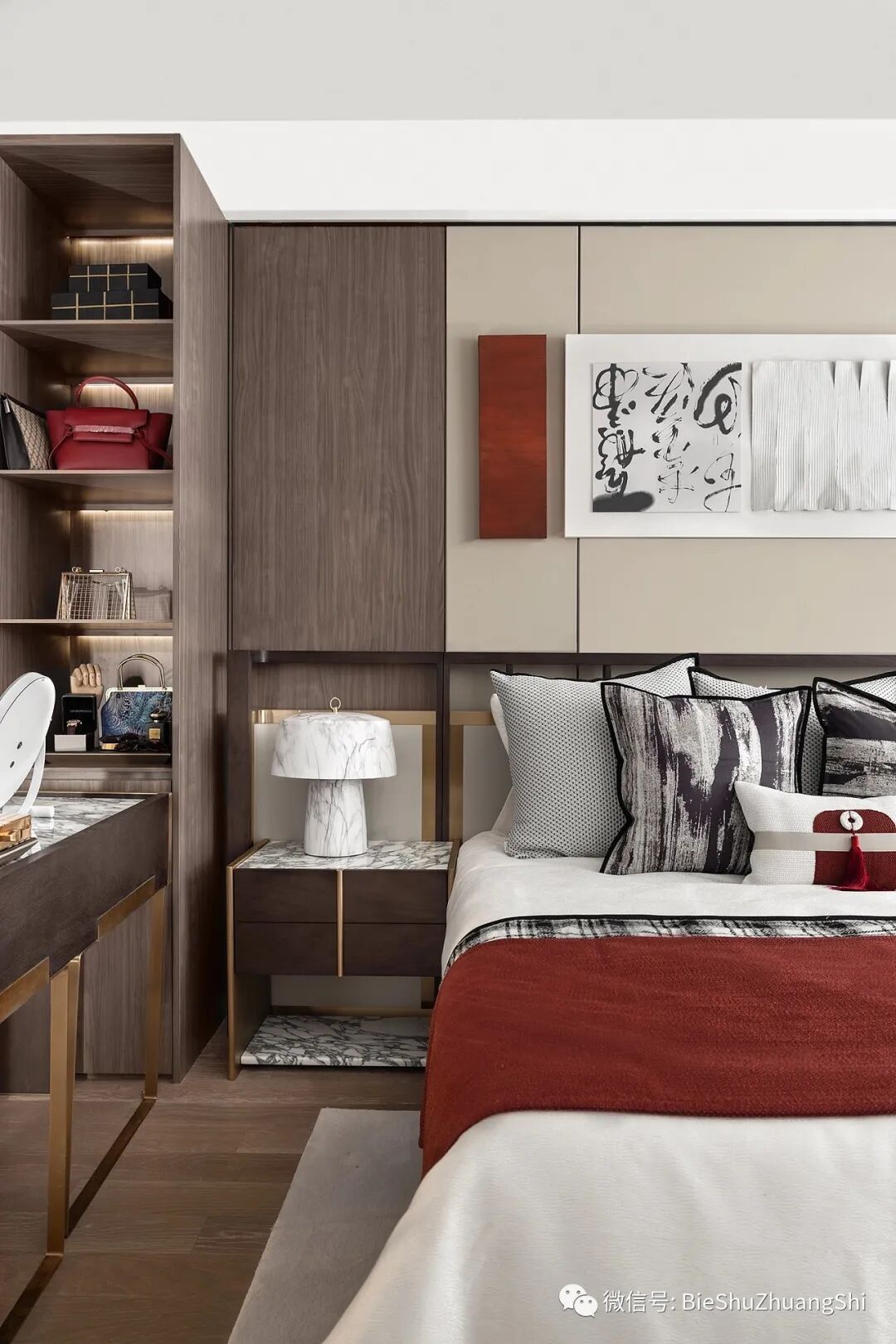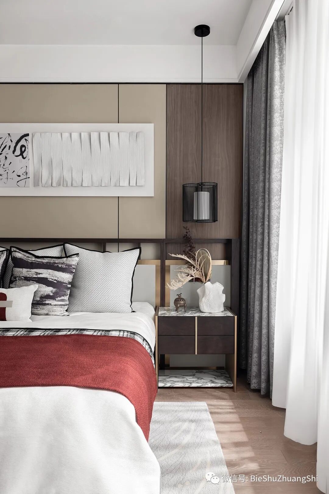 主卧以木色为硬装底色,氤红的点缀,成为空间中灵动的美学注脚,现代和新中,安静而不张扬,赋予空间纯粹而高级的观感。