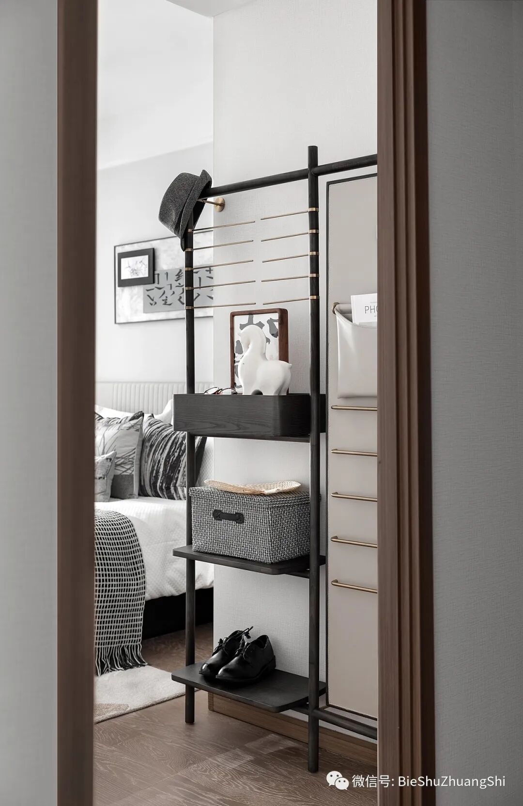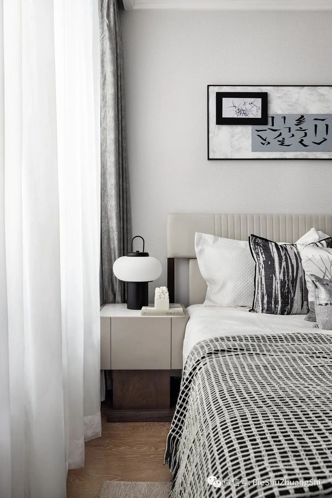 每件单品和材质都在空间里相交织,为了突出沉稳明净的卧室主题,设计舍去厚重的装饰,只留重点饰物的表达,内敛中透着雅致的空间气质。