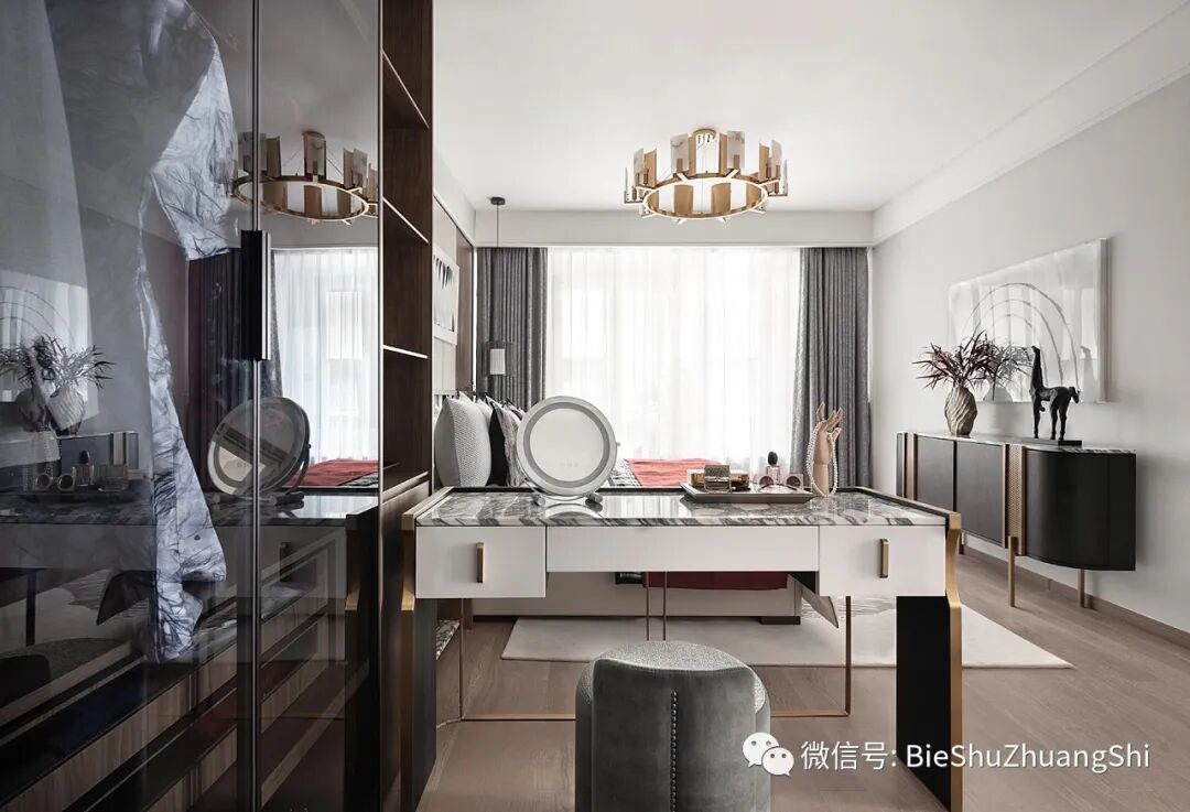 设计将主卧打造为一个岁月沉淀、褪去浮华后的静谧空间;梳妆台和衣帽间配置其中,合理的动线分区,提供了生活的舒适与便利,体现了对高品质生活的追求。