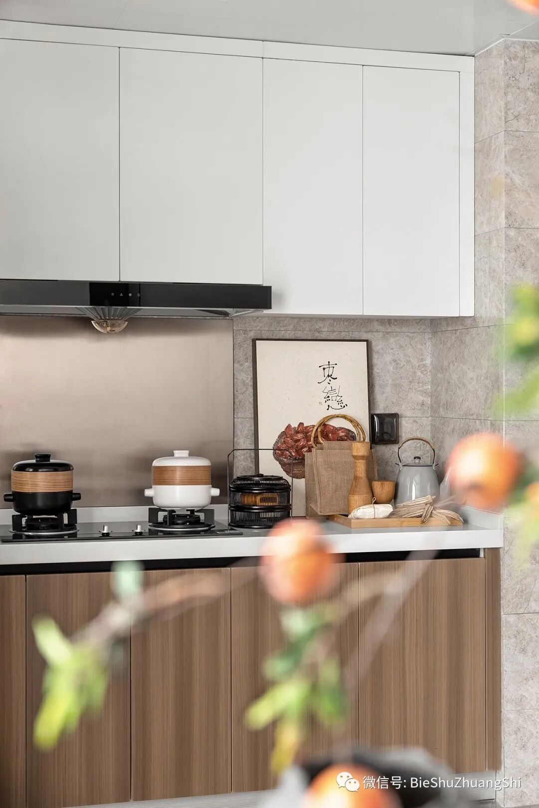 这里是现代风尚布局的合集,原木色的定制橱柜,和白色的吊柜不仅提供了收纳,而且分割了视线,达成层次的美感,再辅以灰色的大理石界面,现代美学被表现的淋漓尽致。