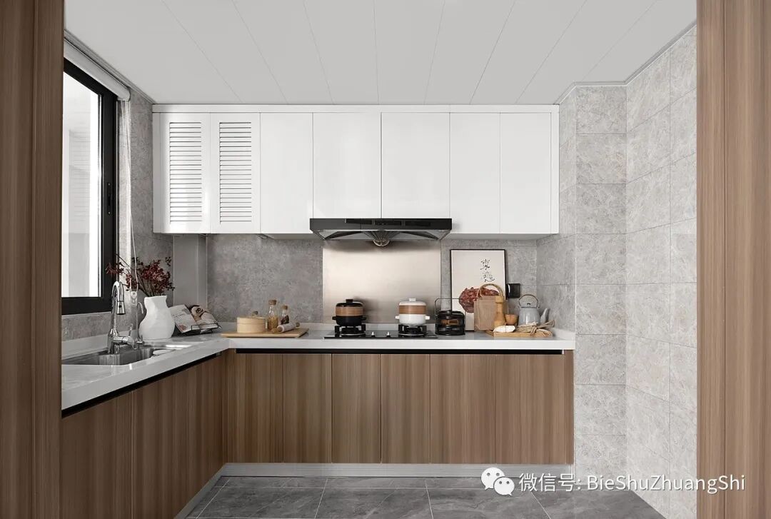 厨房线条利落,布局简洁,L型操作台方便实用,家用设计功能齐全,渲染出空间灵动的气氛,也让时间停在了此刻。