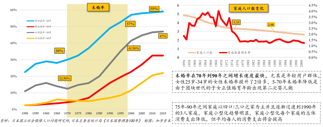 大众消费时期,城镇化水平高,人均消费能力持续增强,大量人群在城市工作生活,1990年左右从事第三产业的比重达到60%,白领与服务行业的蓝领人群扩大。他们忙于工作,下班晚,下班后聚餐,回家时间晚,个人和单身现象增多,家庭小型化趋势加快。
