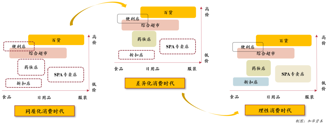 差异化消费时代,出现了药妆店、便利店为主(中价的食品)