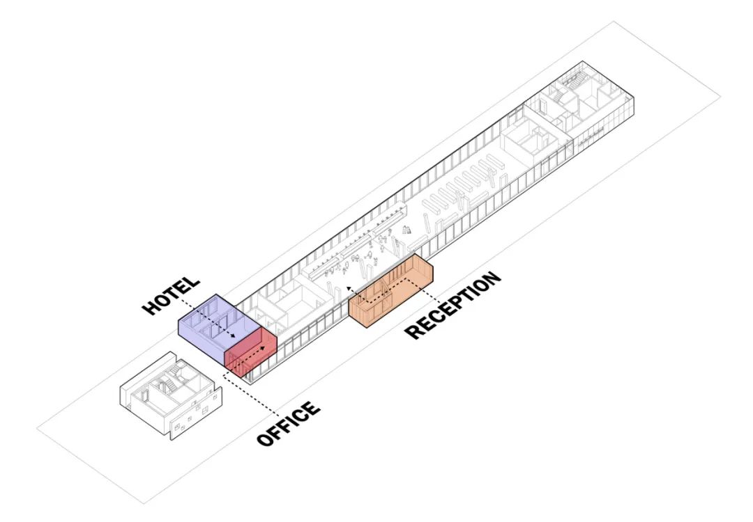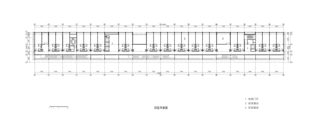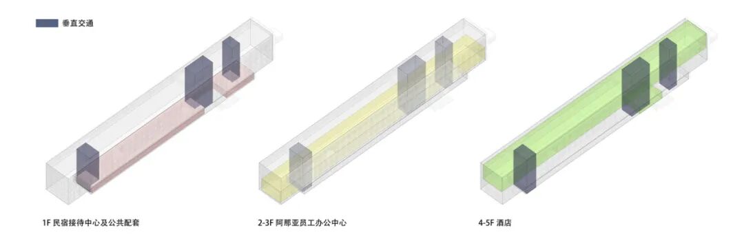 建筑首层主要为民宿接待中心及相关配套,为游客提供入住办理以及咨询服务。接待大厅为两层挑空空间,保证了室内的自然光照,避免了人流量较大时的空间压抑感。建筑二、三层为员工办公中心,其中包含会议、办公和休闲活动功能。四、五层为度假酒店,总计54间客房。不同功能空间的垂直交通各自独立,在满足疏散要求的同时,尽量集约化竖向交通空间。