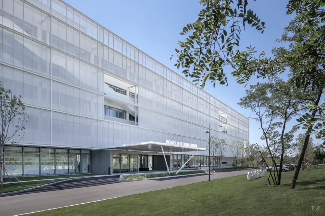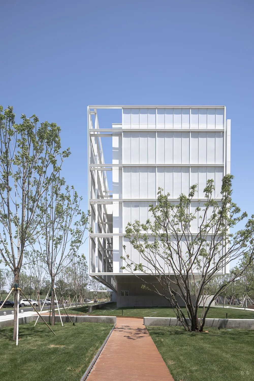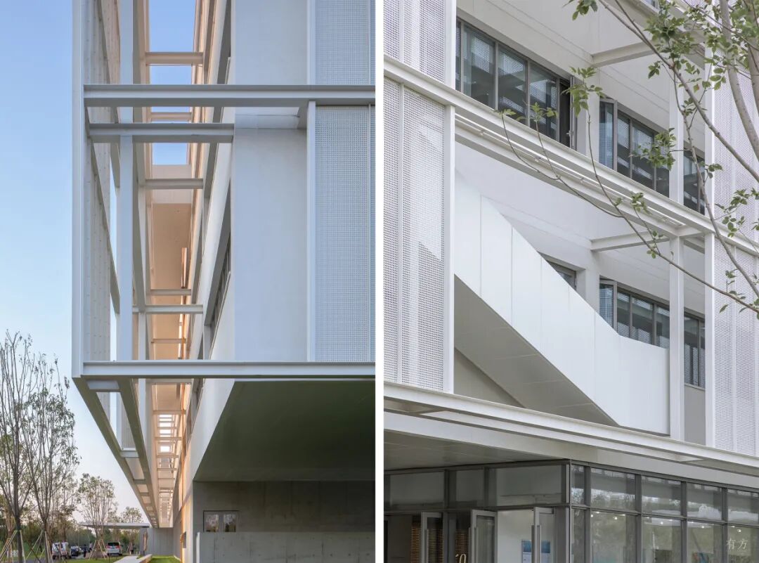 白色金属幕墙同时遮挡了建筑西侧服务空间,增强了使用空间的私密性。幕墙局部镂空,增加建筑立面的丰富性,形成了入口处主要的建筑形象面。