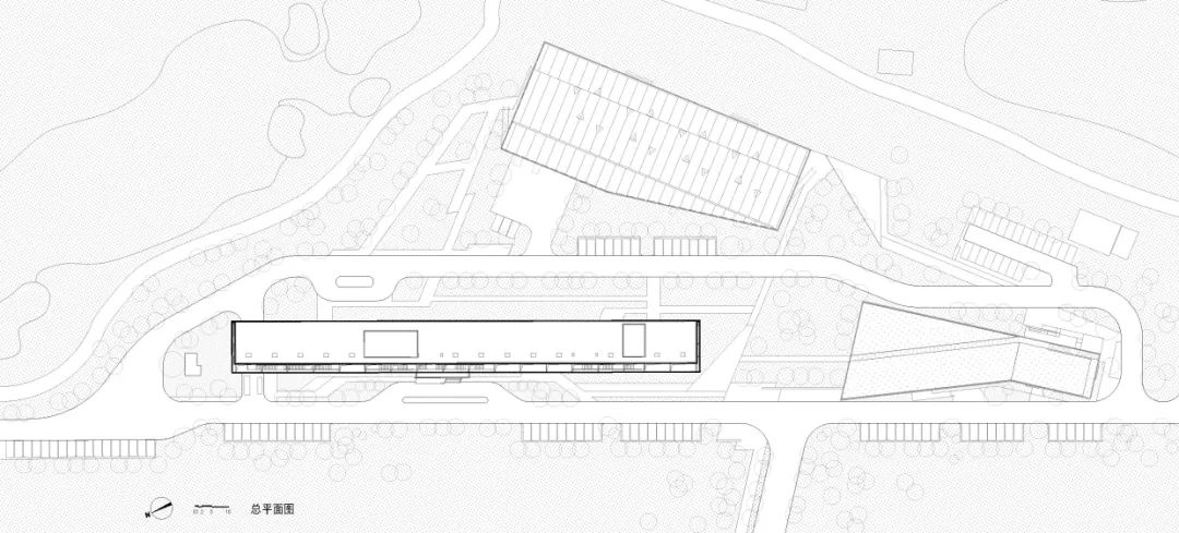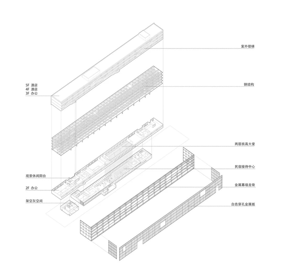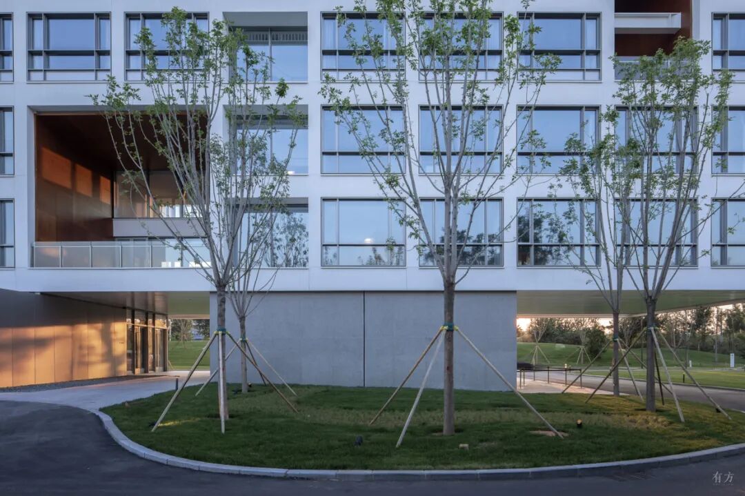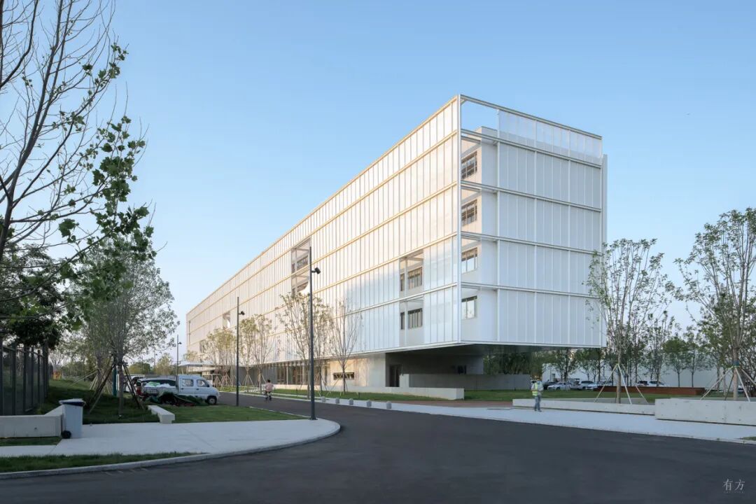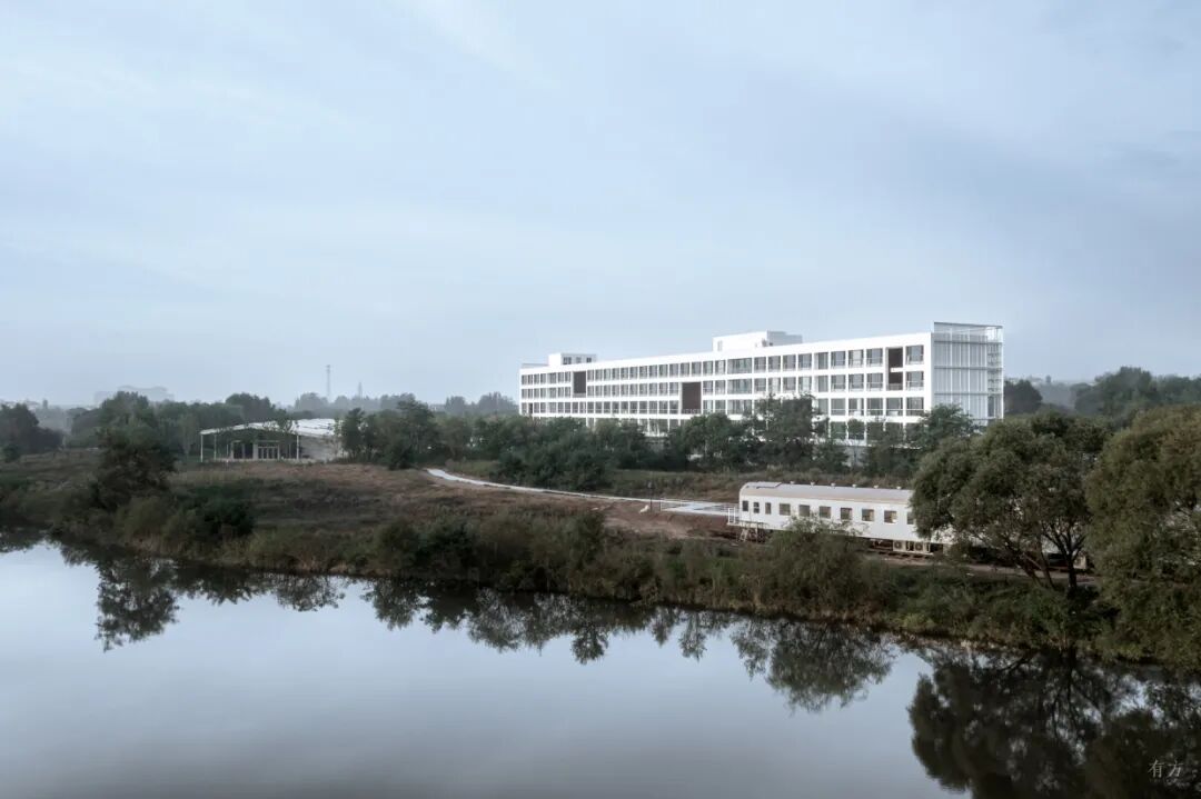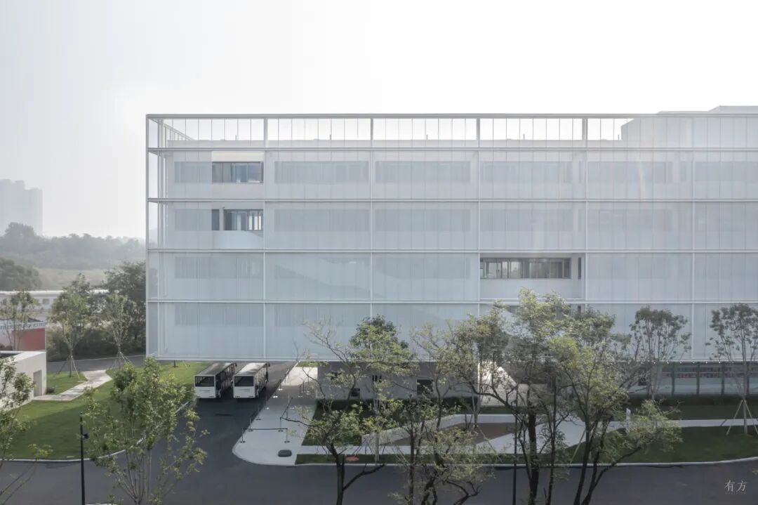 由于场地边界的限制,空间被集约至单一体量。为了更好与周边自然景观协调,建筑西侧采用白色穿孔金属板包裹,半透的建筑立面削弱了建筑厚重感。首层的局部架空与悬挑使建筑整体呈现出漂浮感,视觉上更显轻盈。