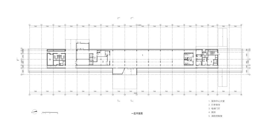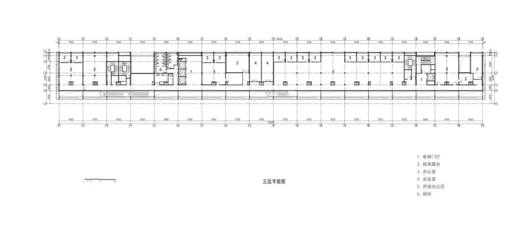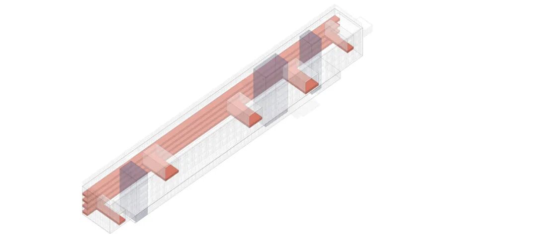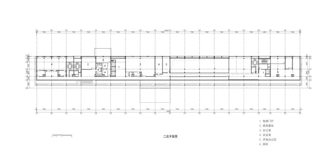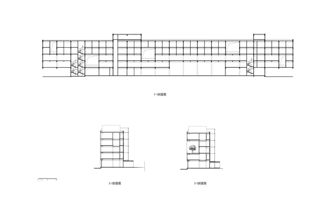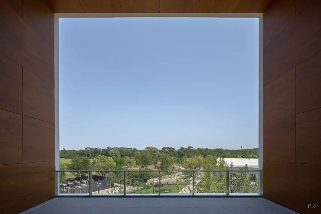 建筑首层局部为架空空间,南北两端为悬挑结构。首层空间的通透性保证了东侧景观的渗入,同时形成更丰富的室内外空间转换。